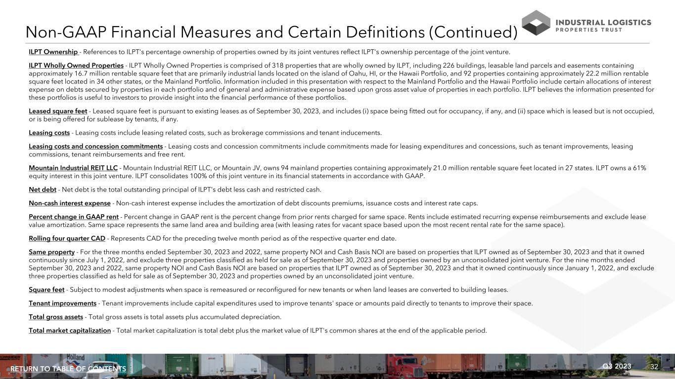 32Q3 2023RETURN TO TABLE OF CONTENTS ILPT Ownership - References to ILPT's percentage ownership of properties owned by its joint ventures reflect ILPT's ownership percentage of the joint venture. ILPT Wholly Owned Properties - ILPT Wholly Owned Properties is comprised of 318 properties that are wholly owned by ILPT, including 226 buildings, leasable land parcels and easements containing approximately 16.7 million rentable square feet that are primarily industrial lands located on the island of Oahu, HI, or the Hawaii Portfolio, and 92 properties containing approximately 22.2 million rentable square feet located in 34 other states, or the Mainland Portfolio. Information included in this presentation with respect to the Mainland Portfolio and the Hawaii Portfolio include certain allocations of interest expense on debts secured by properties in each portfolio and of general and administrative expense based upon gross asset value of properties in each portfolio. ILPT believes the information presented for these portfolios is useful to investors to provide insight into the financial performance of these portfolios. Leased square feet - Leased square feet is pursuant to existing leases as of September 30, 2023, and includes (i) space being fitted out for occupancy, if any, and (ii) space which is leased but is not occupied, or is being offered for sublease by tenants, if any. Leasing costs - Leasing costs include leasing related costs, such as brokerage commissions and tenant inducements. Leasing costs and concession commitments - Leasing costs and concession commitments include commitments made for leasing expenditures and concessions, such as tenant improvements, leasing commissions, tenant reimbursements and free rent. Mountain Industrial REIT LLC - Mountain Industrial REIT LLC, or Mountain JV, owns 94 mainland properties containing approximately 21.0 million rentable square feet located in 27 states. ILPT owns a 61% equity interest in this joint venture. ILPT consolidates 100% of this joint venture in its financial statements in accordance with GAAP. Net debt - Net debt is the total outstanding principal of ILPT's debt less cash and restricted cash. Non-cash interest expense - Non-cash interest expense includes the amortization of debt discounts premiums, issuance costs and interest rate caps. Percent change in GAAP rent - Percent change in GAAP rent is the percent change from prior rents charged for same space. Rents include estimated recurring expense reimbursements and exclude lease value amortization. Same space represents the same land area and building area (with leasing rates for vacant space based upon the most recent rental rate for the same space). Rolling four quarter CAD - Represents CAD for the preceding twelve month period as of the respective quarter end date. Same property - For the three months ended September 30, 2023 and 2022, same property NOI and Cash Basis NOI are based on properties that ILPT owned as of September 30, 2023 and that it owned continuously since July 1, 2022, and exclude three properties classified as held for sale as of September 30, 2023 and properties owned by an unconsolidated joint venture. For the nine months ended September 30, 2023 and 2022, same property NOI and Cash Basis NOI are based on properties that ILPT owned as of September 30, 2023 and that it owned continuously since January 1, 2022, and exclude three properties classified as held for sale as of September 30, 2023 and properties owned by an unconsolidated joint venture. Square feet - Subject to modest adjustments when space is remeasured or reconfigured for new tenants or when land leases are converted to building leases. Tenant improvements - Tenant improvements include capital expenditures used to improve tenants' space or amounts paid directly to tenants to improve their space. Total gross assets - Total gross assets is total assets plus accumulated depreciation. Total market capitalization - Total market capitalization is total debt plus the market value of ILPT's common shares at the end of the applicable period. Non-GAAP Financial Measures and Certain Definitions (Continued)