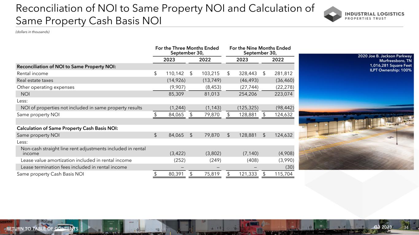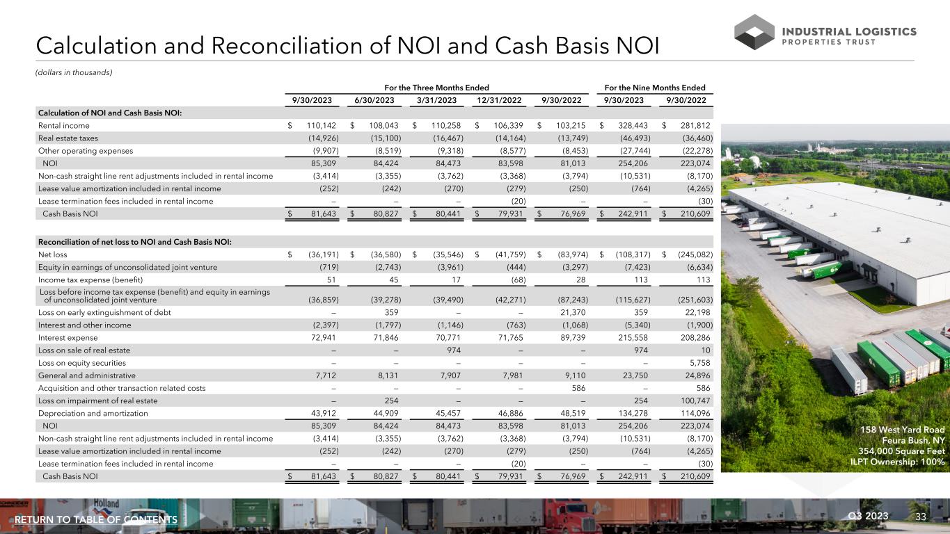 33Q3 2023RETURN TO TABLE OF CONTENTS Calculation and Reconciliation of NOI and Cash Basis NOI (dollars in thousands) For the Three Months Ended For the Nine Months Ended 9/30/2023 6/30/2023 3/31/2023 12/31/2022 9/30/2022 9/30/2023 9/30/2022 Calculation of NOI and Cash Basis NOI: Rental income $ 110,142 $ 108,043 $ 110,258 $ 106,339 $ 103,215 $ 328,443 $ 281,812 Real estate taxes (14,926) (15,100) (16,467) (14,164) (13,749) (46,493) (36,460) Other operating expenses (9,907) (8,519) (9,318) (8,577) (8,453) (27,744) (22,278) NOI 85,309 84,424 84,473 83,598 81,013 254,206 223,074 Non-cash straight line rent adjustments included in rental income (3,414) (3,355) (3,762) (3,368) (3,794) (10,531) (8,170) Lease value amortization included in rental income (252) (242) (270) (279) (250) (764) (4,265) Lease termination fees included in rental income — — — (20) — — (30) Cash Basis NOI $ 81,643 $ 80,827 $ 80,441 $ 79,931 $ 76,969 $ 242,911 $ 210,609 Reconciliation of net loss to NOI and Cash Basis NOI: Net loss $ (36,191) $ (36,580) $ (35,546) $ (41,759) $ (83,974) $ (108,317) $ (245,082) Equity in earnings of unconsolidated joint venture (719) (2,743) (3,961) (444) (3,297) (7,423) (6,634) Income tax expense (benefit) 51 45 17 (68) 28 113 113 Loss before income tax expense (benefit) and equity in earnings of unconsolidated joint venture (36,859) (39,278) (39,490) (42,271) (87,243) (115,627) (251,603) Loss on early extinguishment of debt — 359 — — 21,370 359 22,198 Interest and other income (2,397) (1,797) (1,146) (763) (1,068) (5,340) (1,900) Interest expense 72,941 71,846 70,771 71,765 89,739 215,558 208,286 Loss on sale of real estate — — 974 — — 974 10 Loss on equity securities — — — — — — 5,758 General and administrative 7,712 8,131 7,907 7,981 9,110 23,750 24,896 Acquisition and other transaction related costs — — — — 586 — 586 Loss on impairment of real estate — 254 — — — 254 100,747 Depreciation and amortization 43,912 44,909 45,457 46,886 48,519 134,278 114,096 NOI 85,309 84,424 84,473 83,598 81,013 254,206 223,074 Non-cash straight line rent adjustments included in rental income (3,414) (3,355) (3,762) (3,368) (3,794) (10,531) (8,170) Lease value amortization included in rental income (252) (242) (270) (279) (250) (764) (4,265) Lease termination fees included in rental income — — — (20) — — (30) Cash Basis NOI $ 81,643 $ 80,827 $ 80,441 $ 79,931 $ 76,969 $ 242,911 $ 210,609 158 West Yard Road Feura Bush, NY 354,000 Square Feet ILPT Ownership: 100%