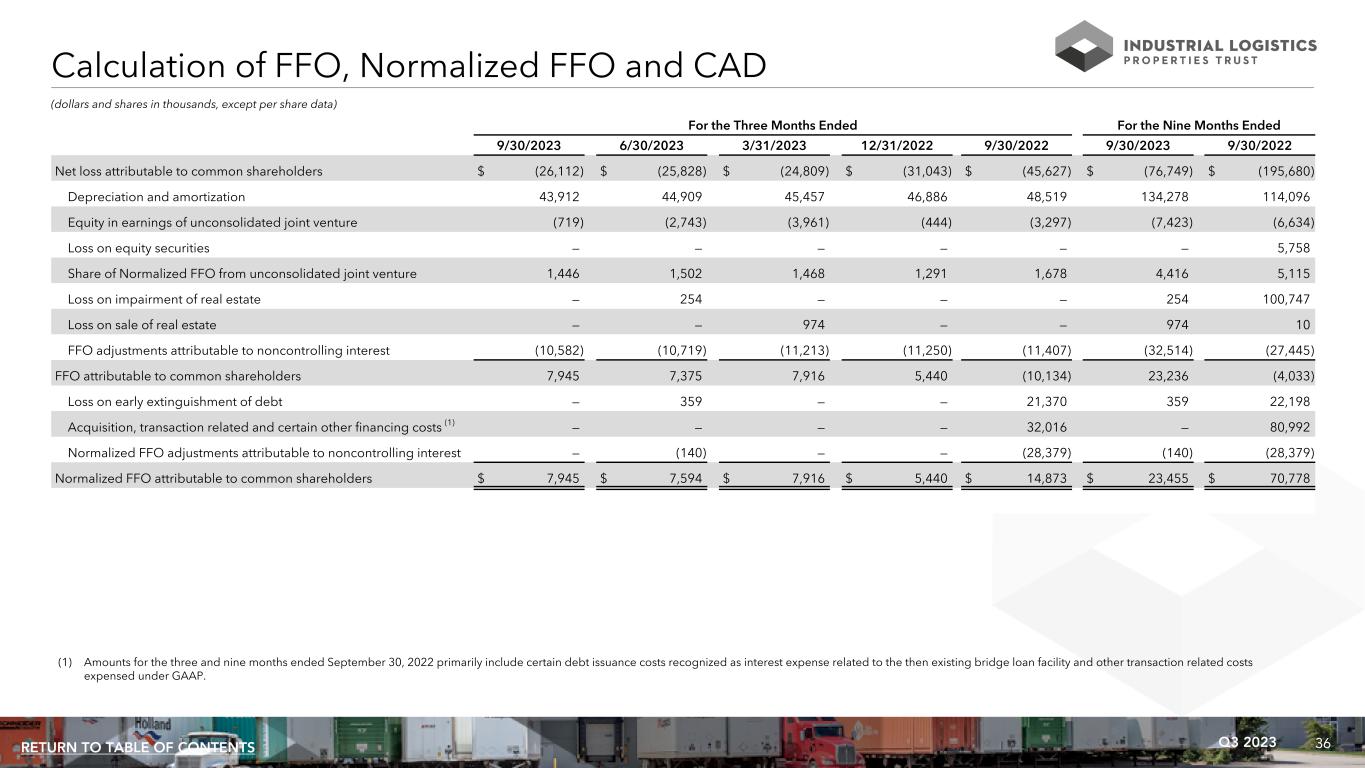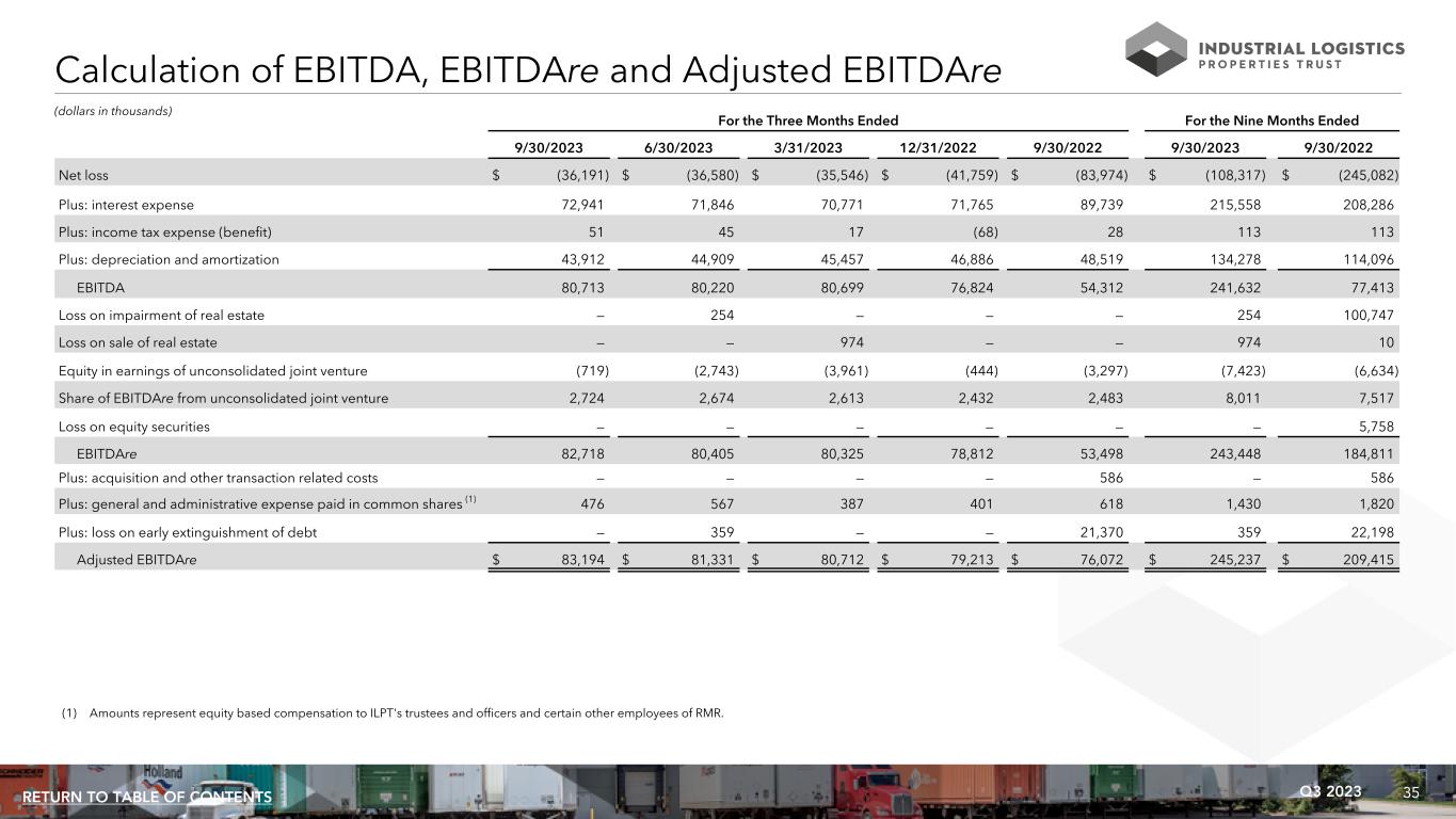 35Q3 2023RETURN TO TABLE OF CONTENTS Calculation of EBITDA, EBITDAre and Adjusted EBITDAre (dollars in thousands) For the Three Months Ended For the Nine Months Ended 9/30/2023 6/30/2023 3/31/2023 12/31/2022 9/30/2022 9/30/2023 9/30/2022 Net loss $ (36,191) $ (36,580) $ (35,546) $ (41,759) $ (83,974) $ (108,317) $ (245,082) Plus: interest expense 72,941 71,846 70,771 71,765 89,739 215,558 208,286 Plus: income tax expense (benefit) 51 45 17 (68) 28 113 113 Plus: depreciation and amortization 43,912 44,909 45,457 46,886 48,519 134,278 114,096 EBITDA 80,713 80,220 80,699 76,824 54,312 241,632 77,413 Loss on impairment of real estate — 254 — — — 254 100,747 Loss on sale of real estate — — 974 — — 974 10 Equity in earnings of unconsolidated joint venture (719) (2,743) (3,961) (444) (3,297) (7,423) (6,634) Share of EBITDAre from unconsolidated joint venture 2,724 2,674 2,613 2,432 2,483 8,011 7,517 Loss on equity securities — — — — — — 5,758 EBITDAre 82,718 80,405 80,325 78,812 53,498 243,448 184,811 Plus: acquisition and other transaction related costs — — — — 586 — 586 Plus: general and administrative expense paid in common shares (1) 476 567 387 401 618 1,430 1,820 Plus: loss on early extinguishment of debt — 359 — — 21,370 359 22,198 Adjusted EBITDAre $ 83,194 $ 81,331 $ 80,712 $ 79,213 $ 76,072 $ 245,237 $ 209,415 (1) Amounts represent equity based compensation to ILPT's trustees and officers and certain other employees of RMR.