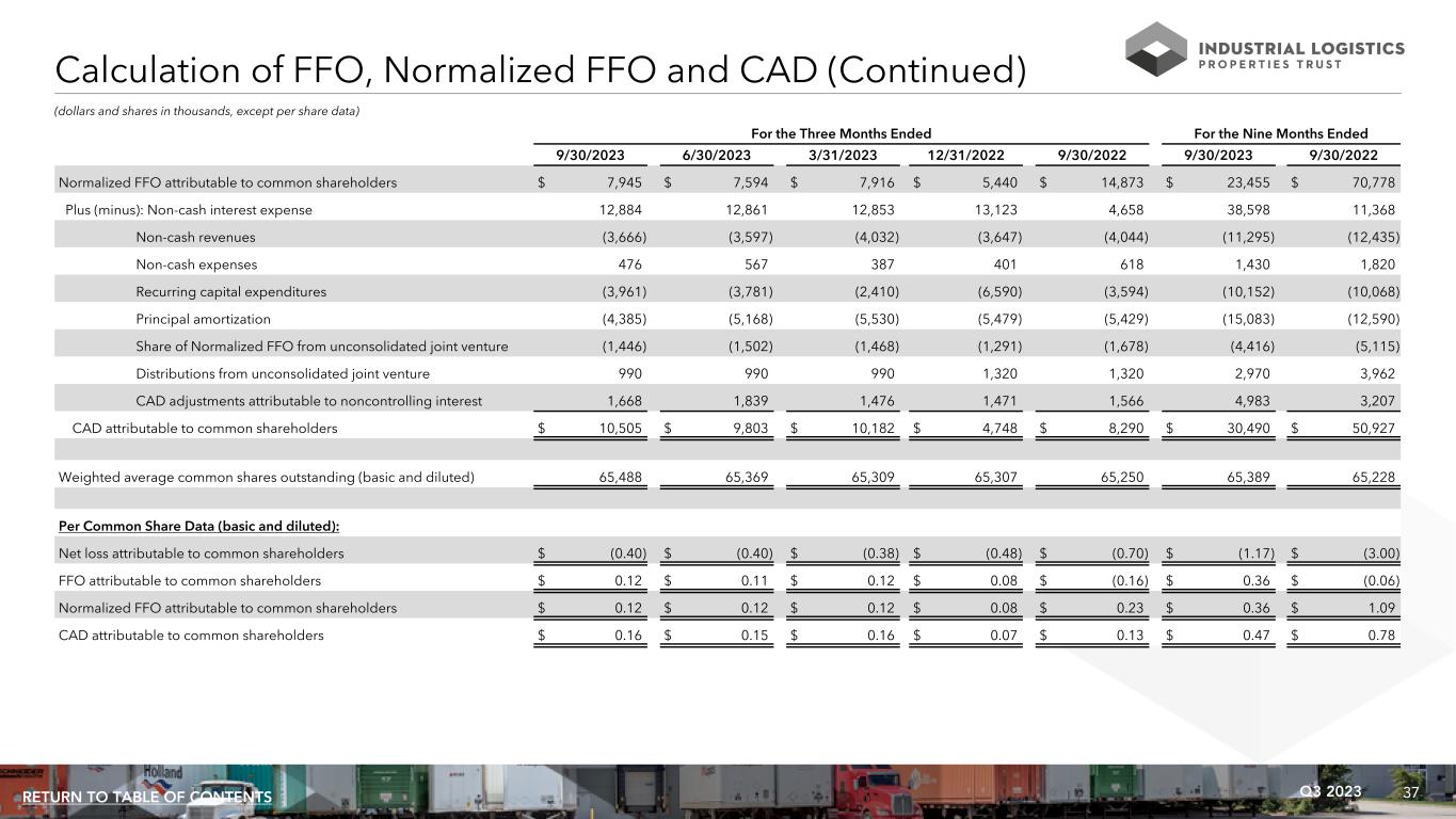36Q3 2023RETURN TO TABLE OF CONTENTS Calculation of FFO, Normalized FFO and CAD (dollars and shares in thousands, except per share data) For the Three Months Ended For the Nine Months Ended 9/30/2023 6/30/2023 3/31/2023 12/31/2022 9/30/2022 9/30/2023 9/30/2022 Net loss attributable to common shareholders $ (26,112) $ (25,828) $ (24,809) $ (31,043) $ (45,627) $ (76,749) $ (195,680) Depreciation and amortization 43,912 44,909 45,457 46,886 48,519 134,278 114,096 Equity in earnings of unconsolidated joint venture (719) (2,743) (3,961) (444) (3,297) (7,423) (6,634) Loss on equity securities — — — — — — 5,758 Share of Normalized FFO from unconsolidated joint venture 1,446 1,502 1,468 1,291 1,678 4,416 5,115 Loss on impairment of real estate — 254 — — — 254 100,747 Loss on sale of real estate — — 974 — — 974 10 FFO adjustments attributable to noncontrolling interest (10,582) (10,719) (11,213) (11,250) (11,407) (32,514) (27,445) FFO attributable to common shareholders 7,945 7,375 7,916 5,440 (10,134) 23,236 (4,033) Loss on early extinguishment of debt — 359 — — 21,370 359 22,198 Acquisition, transaction related and certain other financing costs (1) — — — — 32,016 — 80,992 Normalized FFO adjustments attributable to noncontrolling interest — (140) — — (28,379) (140) (28,379) Normalized FFO attributable to common shareholders $ 7,945 $ 7,594 $ 7,916 $ 5,440 $ 14,873 $ 23,455 $ 70,778 (1) Amounts for the three and nine months ended September 30, 2022 primarily include certain debt issuance costs recognized as interest expense related to the then existing bridge loan facility and other transaction related costs expensed under GAAP.