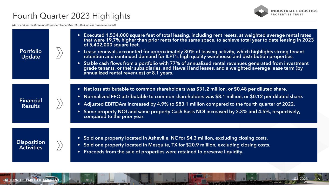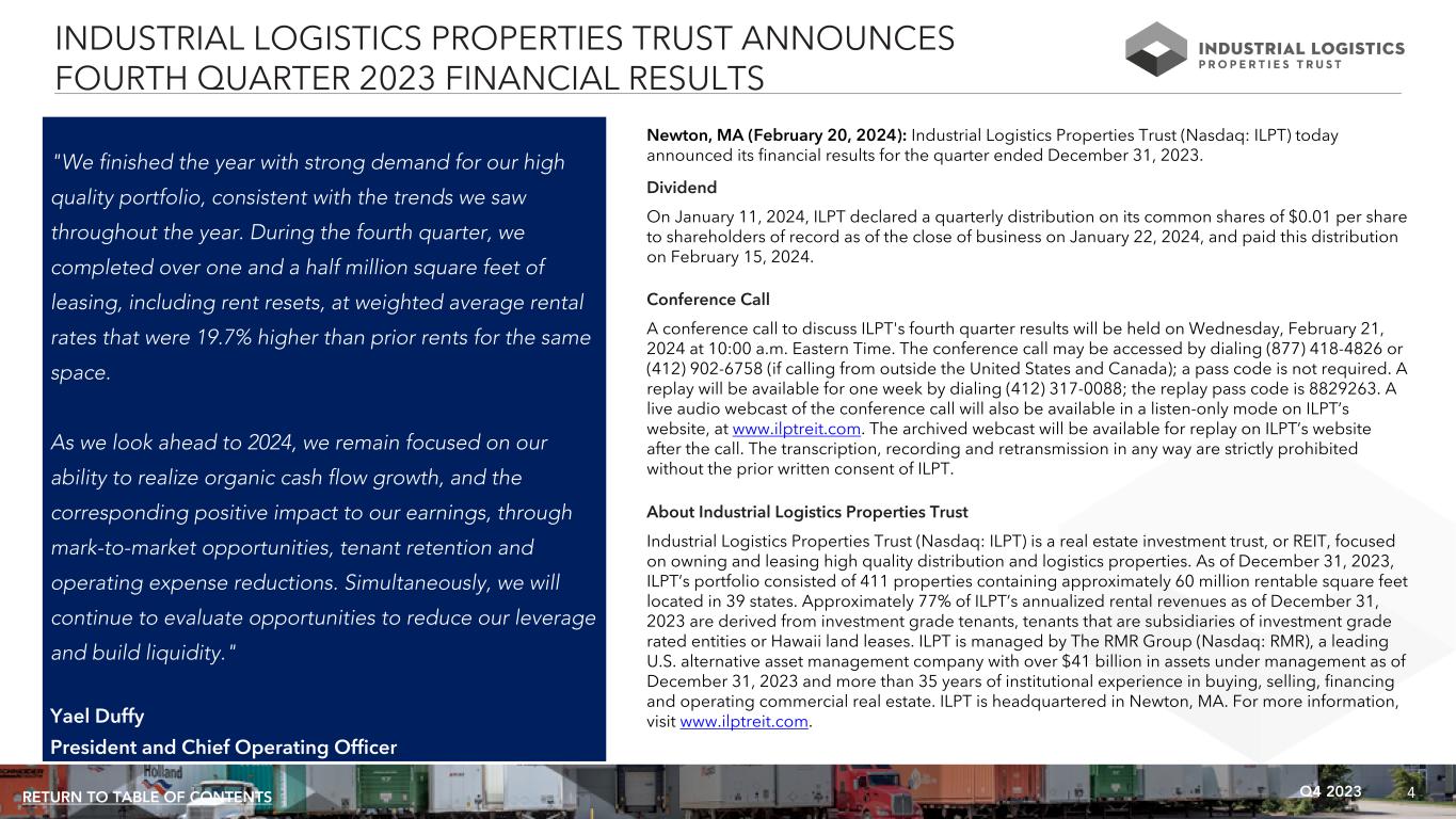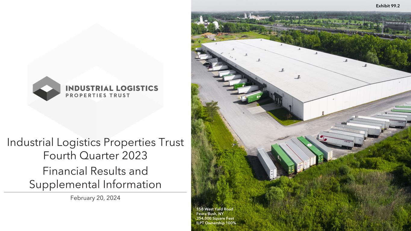 4Q4 2023RETURN TO TABLE OF CONTENTS "We finished the year with strong demand for our high quality portfolio, consistent with the trends we saw throughout the year. During the fourth quarter, we completed over one and a half million square feet of leasing, including rent resets, at weighted average rental rates that were 19.7% higher than prior rents for the same space. As we look ahead to 2024, we remain focused on our ability to realize organic cash flow growth, and the corresponding positive impact to our earnings, through mark-to-market opportunities, tenant retention and operating expense reductions. Simultaneously, we will continue to evaluate opportunities to reduce our leverage and build liquidity." Yael Duffy President and Chief Operating Officer INDUSTRIAL LOGISTICS PROPERTIES TRUST ANNOUNCES FOURTH QUARTER 2023 FINANCIAL RESULTS Newton, MA (February 20, 2024): Industrial Logistics Properties Trust (Nasdaq: ILPT) today announced its financial results for the quarter ended December 31, 2023. Dividend On January 11, 2024, ILPT declared a quarterly distribution on its common shares of $0.01 per share to shareholders of record as of the close of business on January 22, 2024, and paid this distribution on February 15, 2024. Conference Call A conference call to discuss ILPT's fourth quarter results will be held on Wednesday, February 21, 2024 at 10:00 a.m. Eastern Time. The conference call may be accessed by dialing (877) 418-4826 or (412) 902-6758 (if calling from outside the United States and Canada); a pass code is not required. A replay will be available for one week by dialing (412) 317-0088; the replay pass code is 8829263. A live audio webcast of the conference call will also be available in a listen-only mode on ILPT’s website, at www.ilptreit.com. The archived webcast will be available for replay on ILPT’s website after the call. The transcription, recording and retransmission in any way are strictly prohibited without the prior written consent of ILPT. About Industrial Logistics Properties Trust Industrial Logistics Properties Trust (Nasdaq: ILPT) is a real estate investment trust, or REIT, focused on owning and leasing high quality distribution and logistics properties. As of December 31, 2023, ILPT’s portfolio consisted of 411 properties containing approximately 60 million rentable square feet located in 39 states. Approximately 77% of ILPT’s annualized rental revenues as of December 31, 2023 are derived from investment grade tenants, tenants that are subsidiaries of investment grade rated entities or Hawaii land leases. ILPT is managed by The RMR Group (Nasdaq: RMR), a leading U.S. alternative asset management company with over $41 billion in assets under management as of December 31, 2023 and more than 35 years of institutional experience in buying, selling, financing and operating commercial real estate. ILPT is headquartered in Newton, MA. For more information, visit www.ilptreit.com.