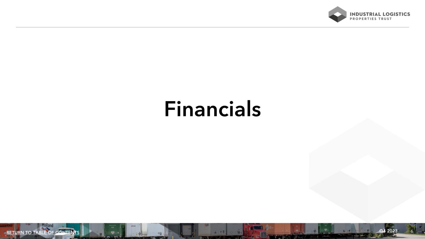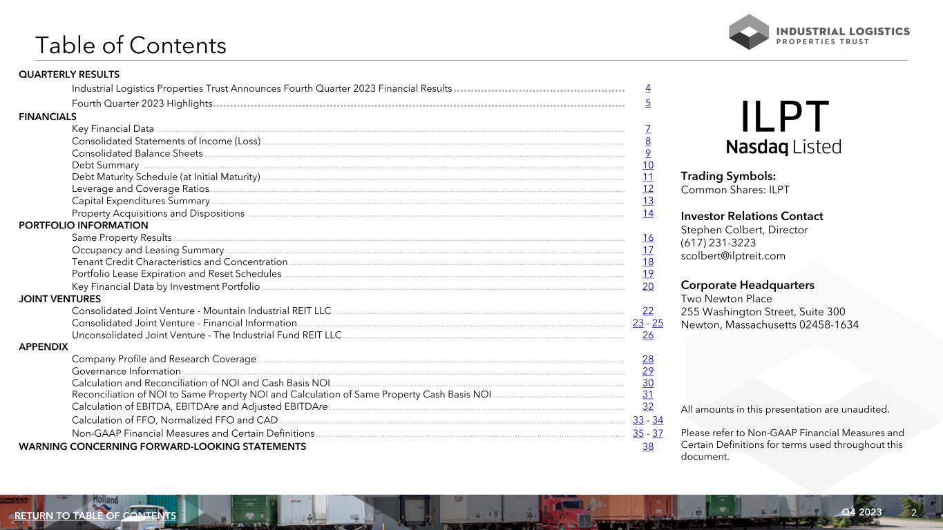 2Q4 2023RETURN TO TABLE OF CONTENTS QUARTERLY RESULTS Industrial Logistics Properties Trust Announces Fourth Quarter 2023 Financial Results .................................................. 4 Fourth Quarter 2023 Highlights ........................................................................................................................ 5 FINANCIALS Key Financial Data ............................................................................................................................................................................................... 7 Consolidated Statements of Income (Loss) .................................................................................................................................................... 8 Consolidated Balance Sheets ........................................................................................................................................................................... 9 Debt Summary .................................................................................................................................................................................................... 10 Debt Maturity Schedule (at Initial Maturity) .................................................................................................................................................... 11 Leverage and Coverage Ratios ......................................................................................................................................................................... 12 Capital Expenditures Summary ......................................................................................................................................................................... 13 Property Acquisitions and Dispositions ......................................................................................................................................................... 14 PORTFOLIO INFORMATION Same Property Results ........................................................................................................................................................................................ 16 Occupancy and Leasing Summary ................................................................................................................................................................... 17 Tenant Credit Characteristics and Concentration ......................................................................................................................................... 18 Portfolio Lease Expiration and Reset Schedules ........................................................................................................................................... 19 Key Financial Data by Investment Portfolio .................................................................................................................................................... 20 JOINT VENTURES Consolidated Joint Venture - Mountain Industrial REIT LLC ....................................................................................................................... 22 Consolidated Joint Venture - Financial Information ..................................................................................................................................... 23 - 25 Unconsolidated Joint Venture - The Industrial Fund REIT LLC ................................................................................................................... 26 APPENDIX Company Profile and Research Coverage ...................................................................................................................................................... 28 Governance Information .................................................................................................................................................................................... 29 Calculation and Reconciliation of NOI and Cash Basis NOI ........................................................................................................................ 30 Reconciliation of NOI to Same Property NOI and Calculation of Same Property Cash Basis NOI ...................................................... 31 Calculation of EBITDA, EBITDAre and Adjusted EBITDAre ......................................................................................................................... 32 Calculation of FFO, Normalized FFO and CAD ............................................................................................................................................. 33 - 34 Non-GAAP Financial Measures and Certain Definitions .............................................................................................................................. 35 - 37 WARNING CONCERNING FORWARD-LOOKING STATEMENTS 38 Table of Contents All amounts in this presentation are unaudited. Please refer to Non-GAAP Financial Measures and Certain Definitions for terms used throughout this document. Trading Symbols: Common Shares: ILPT Investor Relations Contact Stephen Colbert, Director (617) 231-3223 scolbert@ilptreit.com Corporate Headquarters Two Newton Place 255 Washington Street, Suite 300 Newton, Massachusetts 02458-1634