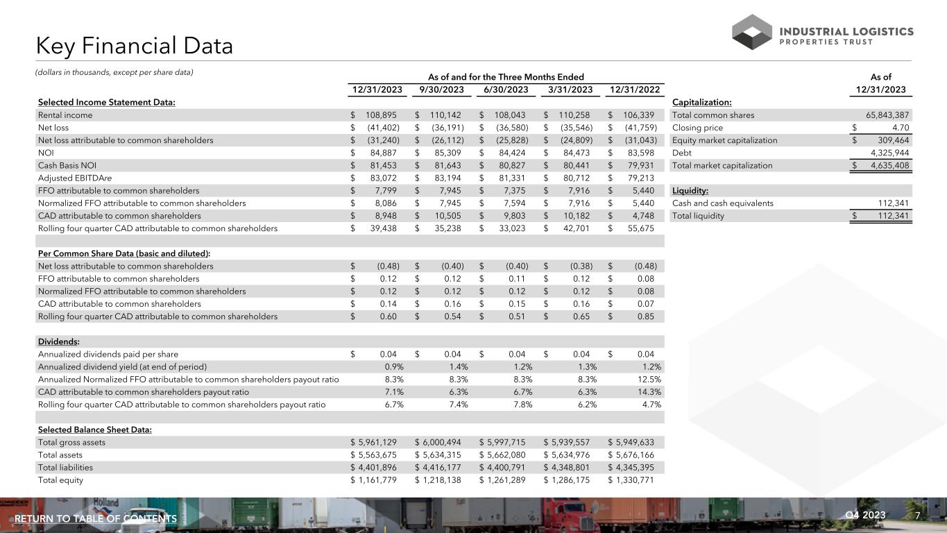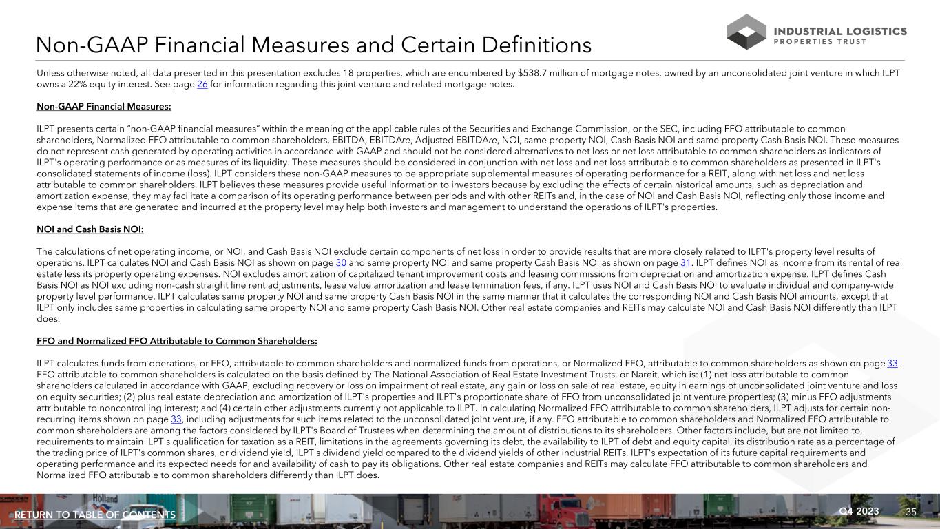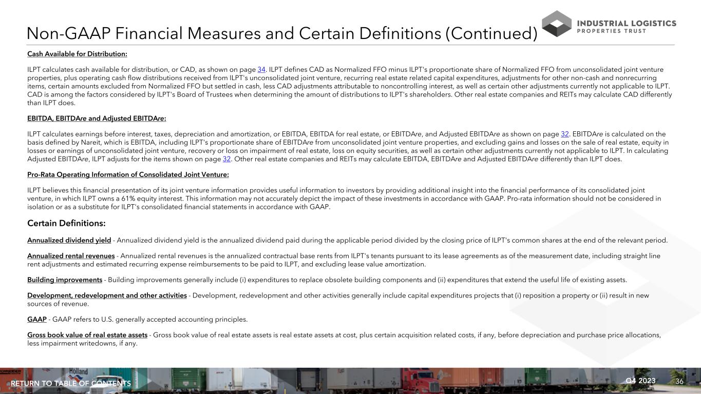 35Q4 2023RETURN TO TABLE OF CONTENTS Unless otherwise noted, all data presented in this presentation excludes 18 properties, which are encumbered by $538.7 million of mortgage notes, owned by an unconsolidated joint venture in which ILPT owns a 22% equity interest. See page 26 for information regarding this joint venture and related mortgage notes. Non-GAAP Financial Measures: ILPT presents certain “non-GAAP financial measures” within the meaning of the applicable rules of the Securities and Exchange Commission, or the SEC, including FFO attributable to common shareholders, Normalized FFO attributable to common shareholders, EBITDA, EBITDAre, Adjusted EBITDAre, NOI, same property NOI, Cash Basis NOI and same property Cash Basis NOI. These measures do not represent cash generated by operating activities in accordance with GAAP and should not be considered alternatives to net loss or net loss attributable to common shareholders as indicators of ILPT's operating performance or as measures of its liquidity. These measures should be considered in conjunction with net loss and net loss attributable to common shareholders as presented in ILPT's consolidated statements of income (loss). ILPT considers these non-GAAP measures to be appropriate supplemental measures of operating performance for a REIT, along with net loss and net loss attributable to common shareholders. ILPT believes these measures provide useful information to investors because by excluding the effects of certain historical amounts, such as depreciation and amortization expense, they may facilitate a comparison of its operating performance between periods and with other REITs and, in the case of NOI and Cash Basis NOI, reflecting only those income and expense items that are generated and incurred at the property level may help both investors and management to understand the operations of ILPT's properties. NOI and Cash Basis NOI: The calculations of net operating income, or NOI, and Cash Basis NOI exclude certain components of net loss in order to provide results that are more closely related to ILPT's property level results of operations. ILPT calculates NOI and Cash Basis NOI as shown on page 30 and same property NOI and same property Cash Basis NOI as shown on page 31. ILPT defines NOI as income from its rental of real estate less its property operating expenses. NOI excludes amortization of capitalized tenant improvement costs and leasing commissions from depreciation and amortization expense. ILPT defines Cash Basis NOI as NOI excluding non-cash straight line rent adjustments, lease value amortization and lease termination fees, if any. ILPT uses NOI and Cash Basis NOI to evaluate individual and company-wide property level performance. ILPT calculates same property NOI and same property Cash Basis NOI in the same manner that it calculates the corresponding NOI and Cash Basis NOI amounts, except that ILPT only includes same properties in calculating same property NOI and same property Cash Basis NOI. Other real estate companies and REITs may calculate NOI and Cash Basis NOI differently than ILPT does. FFO and Normalized FFO Attributable to Common Shareholders: ILPT calculates funds from operations, or FFO, attributable to common shareholders and normalized funds from operations, or Normalized FFO, attributable to common shareholders as shown on page 33. FFO attributable to common shareholders is calculated on the basis defined by The National Association of Real Estate Investment Trusts, or Nareit, which is: (1) net loss attributable to common shareholders calculated in accordance with GAAP, excluding recovery or loss on impairment of real estate, any gain or loss on sale of real estate, equity in earnings of unconsolidated joint venture and loss on equity securities; (2) plus real estate depreciation and amortization of ILPT's properties and ILPT's proportionate share of FFO from unconsolidated joint venture properties; (3) minus FFO adjustments attributable to noncontrolling interest; and (4) certain other adjustments currently not applicable to ILPT. In calculating Normalized FFO attributable to common shareholders, ILPT adjusts for certain non- recurring items shown on page 33, including adjustments for such items related to the unconsolidated joint venture, if any. FFO attributable to common shareholders and Normalized FFO attributable to common shareholders are among the factors considered by ILPT's Board of Trustees when determining the amount of distributions to its shareholders. Other factors include, but are not limited to, requirements to maintain ILPT's qualification for taxation as a REIT, limitations in the agreements governing its debt, the availability to ILPT of debt and equity capital, its distribution rate as a percentage of the trading price of ILPT's common shares, or dividend yield, ILPT's dividend yield compared to the dividend yields of other industrial REITs, ILPT's expectation of its future capital requirements and operating performance and its expected needs for and availability of cash to pay its obligations. Other real estate companies and REITs may calculate FFO attributable to common shareholders and Normalized FFO attributable to common shareholders differently than ILPT does. Non-GAAP Financial Measures and Certain Definitions