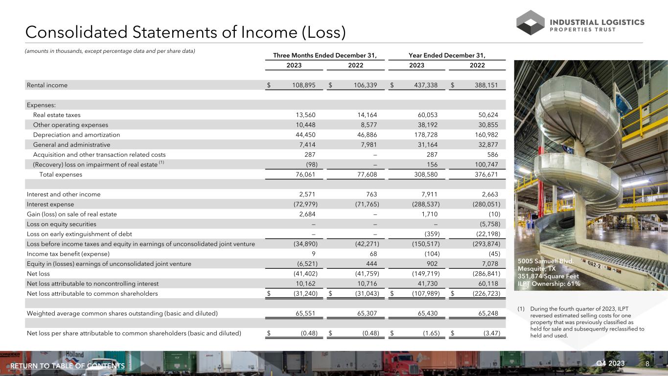8Q4 2023RETURN TO TABLE OF CONTENTS Consolidated Statements of Income (Loss) Three Months Ended December 31, Year Ended December 31, 2023 2022 2023 2022 Rental income $ 108,895 $ 106,339 $ 437,338 $ 388,151 Expenses: Real estate taxes 13,560 14,164 60,053 50,624 Other operating expenses 10,448 8,577 38,192 30,855 Depreciation and amortization 44,450 46,886 178,728 160,982 General and administrative 7,414 7,981 31,164 32,877 Acquisition and other transaction related costs 287 — 287 586 (Recovery) loss on impairment of real estate (1) (98) — 156 100,747 Total expenses 76,061 77,608 308,580 376,671 Interest and other income 2,571 763 7,911 2,663 Interest expense (72,979) (71,765) (288,537) (280,051) Gain (loss) on sale of real estate 2,684 — 1,710 (10) Loss on equity securities — — — (5,758) Loss on early extinguishment of debt — — (359) (22,198) Loss before income taxes and equity in earnings of unconsolidated joint venture (34,890) (42,271) (150,517) (293,874) Income tax benefit (expense) 9 68 (104) (45) Equity in (losses) earnings of unconsolidated joint venture (6,521) 444 902 7,078 Net loss (41,402) (41,759) (149,719) (286,841) Net loss attributable to noncontrolling interest 10,162 10,716 41,730 60,118 Net loss attributable to common shareholders $ (31,240) $ (31,043) $ (107,989) $ (226,723) Weighted average common shares outstanding (basic and diluted) 65,551 65,307 65,430 65,248 Net loss per share attributable to common shareholders (basic and diluted) $ (0.48) $ (0.48) $ (1.65) $ (3.47) (amounts in thousands, except percentage data and per share data) 5005 Samuell Blvd. Mesquite, TX 351,874 Square Feet ILPT Ownership: 61% (1) During the fourth quarter of 2023, ILPT reversed estimated selling costs for one property that was previously classified as held for sale and subsequently reclassified to held and used.