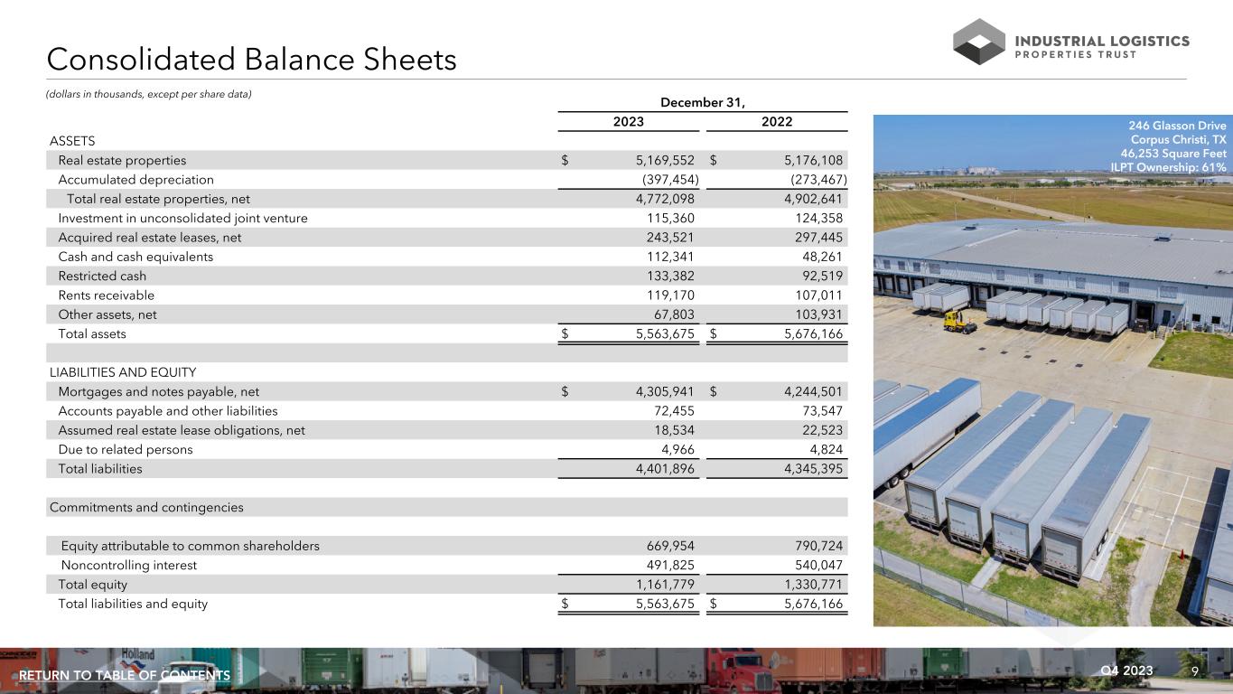 9Q4 2023RETURN TO TABLE OF CONTENTS Consolidated Balance Sheets December 31, 2023 2022 ASSETS Real estate properties $ 5,169,552 $ 5,176,108 Accumulated depreciation (397,454) (273,467) Total real estate properties, net 4,772,098 4,902,641 Investment in unconsolidated joint venture 115,360 124,358 Acquired real estate leases, net 243,521 297,445 Cash and cash equivalents 112,341 48,261 Restricted cash 133,382 92,519 Rents receivable 119,170 107,011 Other assets, net 67,803 103,931 Total assets $ 5,563,675 $ 5,676,166 LIABILITIES AND EQUITY Mortgages and notes payable, net $ 4,305,941 $ 4,244,501 Accounts payable and other liabilities 72,455 73,547 Assumed real estate lease obligations, net 18,534 22,523 Due to related persons 4,966 4,824 Total liabilities 4,401,896 4,345,395 Commitments and contingencies Equity attributable to common shareholders 669,954 790,724 Noncontrolling interest 491,825 540,047 Total equity 1,161,779 1,330,771 Total liabilities and equity $ 5,563,675 $ 5,676,166 (dollars in thousands, except per share data) 246 Glasson Drive Corpus Christi, TX 46,253 Square Feet ILPT Ownership: 61%