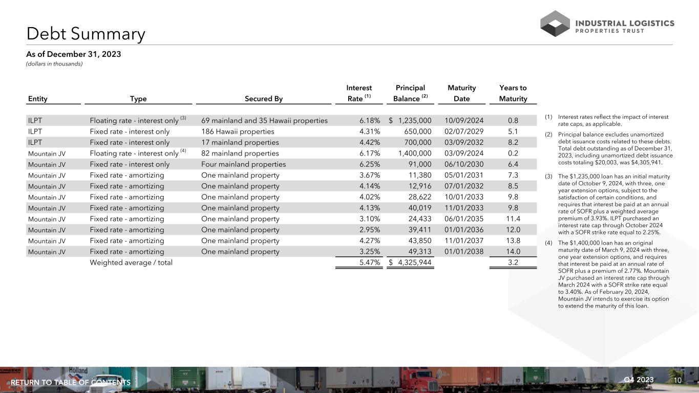 10Q4 2023RETURN TO TABLE OF CONTENTS (1) Interest rates reflect the impact of interest rate caps, as applicable. (2) Principal balance excludes unamortized debt issuance costs related to these debts. Total debt outstanding as of December 31, 2023, including unamortized debt issuance costs totaling $20,003, was $4,305,941. (3) The $1,235,000 loan has an initial maturity date of October 9, 2024, with three, one year extension options, subject to the satisfaction of certain conditions, and requires that interest be paid at an annual rate of SOFR plus a weighted average premium of 3.93%. ILPT purchased an interest rate cap through October 2024 with a SOFR strike rate equal to 2.25%. (4) The $1,400,000 loan has an original maturity date of March 9, 2024 with three, one year extension options, and requires that interest be paid at an annual rate of SOFR plus a premium of 2.77%. Mountain JV purchased an interest rate cap through March 2024 with a SOFR strike rate equal to 3.40%. As of February 20, 2024, Mountain JV intends to exercise its option to extend the maturity of this loan. Interest Principal Maturity Years to Entity Type Secured By Rate (1) Balance (2) Date Maturity ILPT Floating rate - interest only (3) 69 mainland and 35 Hawaii properties 6.18% $ 1,235,000 10/09/2024 0.8 ILPT Fixed rate - interest only 186 Hawaii properties 4.31% 650,000 02/07/2029 5.1 ILPT Fixed rate - interest only 17 mainland properties 4.42% 700,000 03/09/2032 8.2 Mountain JV Floating rate - interest only (4) 82 mainland properties 6.17% 1,400,000 03/09/2024 0.2 Mountain JV Fixed rate - interest only Four mainland properties 6.25% 91,000 06/10/2030 6.4 Mountain JV Fixed rate - amortizing One mainland property 3.67% 11,380 05/01/2031 7.3 Mountain JV Fixed rate - amortizing One mainland property 4.14% 12,916 07/01/2032 8.5 Mountain JV Fixed rate - amortizing One mainland property 4.02% 28,622 10/01/2033 9.8 Mountain JV Fixed rate - amortizing One mainland property 4.13% 40,019 11/01/2033 9.8 Mountain JV Fixed rate - amortizing One mainland property 3.10% 24,433 06/01/2035 11.4 Mountain JV Fixed rate - amortizing One mainland property 2.95% 39,411 01/01/2036 12.0 Mountain JV Fixed rate - amortizing One mainland property 4.27% 43,850 11/01/2037 13.8 Mountain JV Fixed rate - amortizing One mainland property 3.25% 49,313 01/01/2038 14.0 Weighted average / total 5.47% $ 4,325,944 3.2 Debt Summary (dollars in thousands) As of December 31, 2023