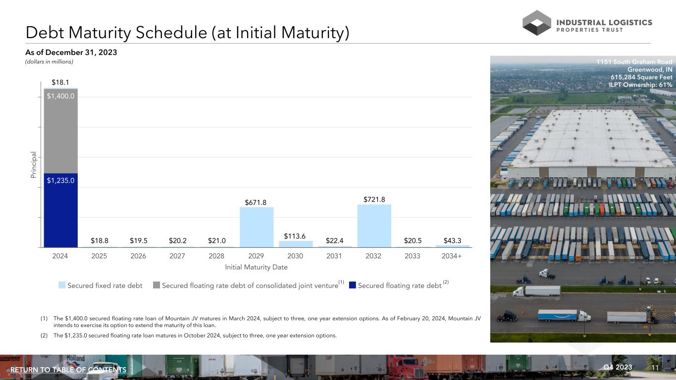 11Q4 2023RETURN TO TABLE OF CONTENTS (1) The $1,400.0 secured floating rate loan of Mountain JV matures in March 2024, subject to three, one year extension options. As of February 20, 2024, Mountain JV intends to exercise its option to extend the maturity of this loan. (2) The $1,235.0 secured floating rate loan matures in October 2024, subject to three, one year extension options. Debt Maturity Schedule (at Initial Maturity) (dollars in millions) As of December 31, 2023 Initial Maturity Date Pr in ci p al $1,235.0 $1,400.0 $18.1 $18.8 $19.5 $20.2 $21.0 $22.4 $20.5 $43.3 Secured fixed rate debt Secured floating rate debt of consolidated joint venture Secured floating rate debt 2024 2025 2026 2027 2028 2029 2030 2031 2032 2033 2034+ (2)(1) 1151 South Graham Road Greenwood, IN 615,284 Square Feet ILPT Ownership: 61% $113.6 $721.8$671.8