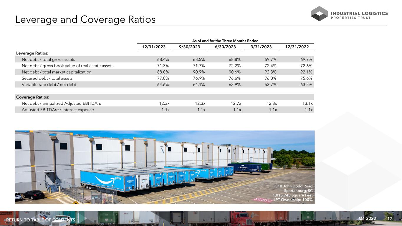 12Q4 2023RETURN TO TABLE OF CONTENTS As of and for the Three Months Ended 12/31/2023 9/30/2023 6/30/2023 3/31/2023 12/31/2022 Leverage Ratios: Net debt / total gross assets 68.4% 68.5% 68.8% 69.7% 69.7% Net debt / gross book value of real estate assets 71.3% 71.7% 72.2% 72.4% 72.6% Net debt / total market capitalization 88.0% 90.9% 90.6% 92.3% 92.1% Secured debt / total assets 77.8% 76.9% 76.6% 76.0% 75.6% Variable rate debt / net debt 64.6% 64.1% 63.9% 63.7% 63.5% Coverage Ratios: Net debt / annualized Adjusted EBITDAre 12.3x 12.3x 12.7x 12.8x 13.1x Adjusted EBITDAre / interest expense 1.1x 1.1x 1.1x 1.1x 1.1x Leverage and Coverage Ratios 510 John Dodd Road Spartanburg, SC 1,015,740 Square Feet ILPT Ownership: 100%