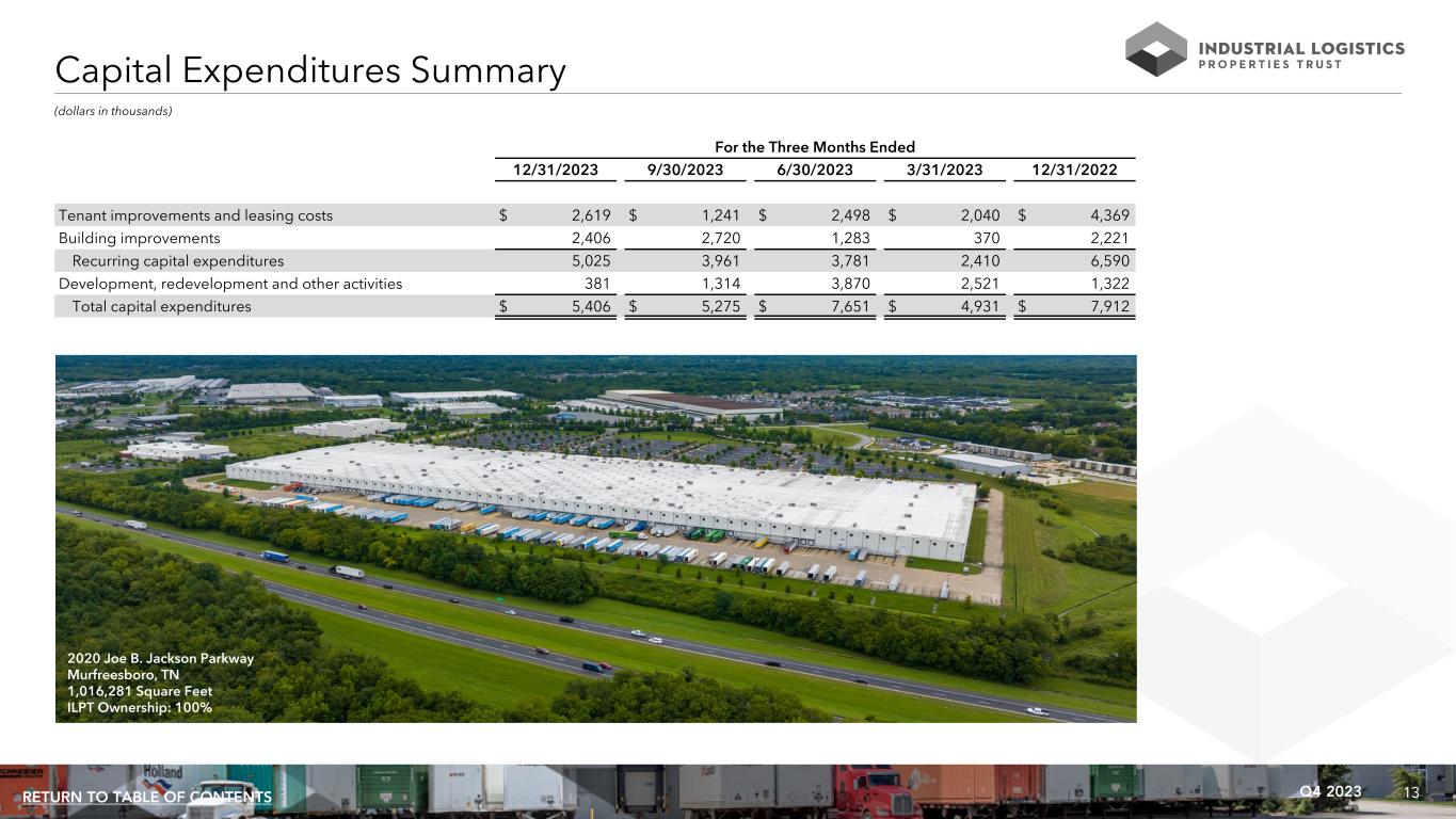 13Q4 2023RETURN TO TABLE OF CONTENTS (dollars in thousands) For the Three Months Ended 12/31/2023 9/30/2023 6/30/2023 3/31/2023 12/31/2022 Tenant improvements and leasing costs $ 2,619 $ 1,241 $ 2,498 $ 2,040 $ 4,369 Building improvements 2,406 2,720 1,283 370 2,221 Recurring capital expenditures 5,025 3,961 3,781 2,410 6,590 Development, redevelopment and other activities 381 1,314 3,870 2,521 1,322 Total capital expenditures $ 5,406 $ 5,275 $ 7,651 $ 4,931 $ 7,912 Capital Expenditures Summary 2020 Joe B. Jackson Parkway Murfreesboro, TN 1,016,281 Square Feet ILPT Ownership: 100%