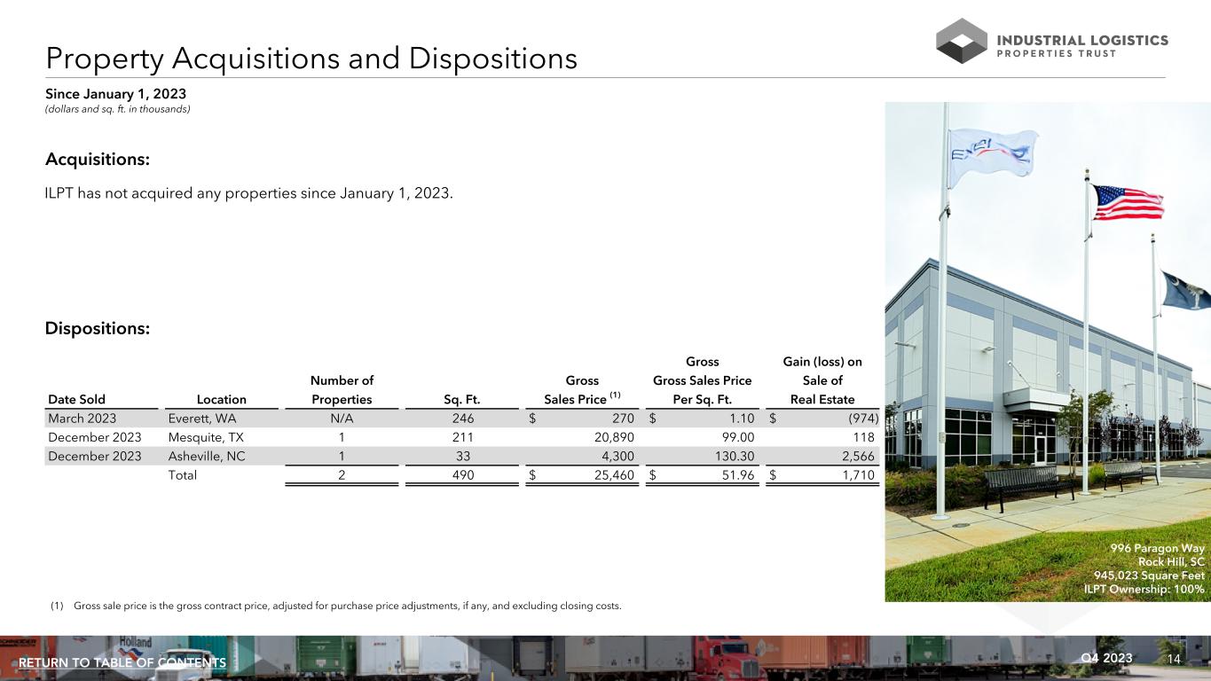 14Q4 2023RETURN TO TABLE OF CONTENTS Property Acquisitions and Dispositions Dispositions: Acquisitions: ILPT has not acquired any properties since January 1, 2023. Since January 1, 2023 (dollars and sq. ft. in thousands) Gross Gain (loss) on Number of Gross Gross Sales Price Sale of Date Sold Location Properties Sq. Ft. Sales Price (1) Per Sq. Ft. Real Estate March 2023 Everett, WA N/A 246 $ 270 $ 1.10 $ (974) December 2023 Mesquite, TX 1 211 20,890 99.00 118 December 2023 Asheville, NC 1 33 4,300 130.30 2,566 Total 2 490 $ 25,460 $ 51.96 $ 1,710 (1) Gross sale price is the gross contract price, adjusted for purchase price adjustments, if any, and excluding closing costs. 996 Paragon Way Rock Hill, SC 945,023 Square Feet ILPT Ownership: 100%