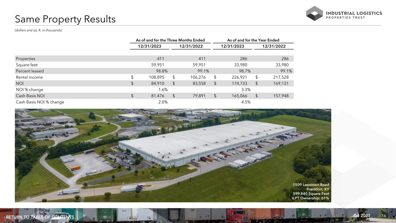 16Q4 2023RETURN TO TABLE OF CONTENTS 1509 Leestown Road Frankfort, KY 599,840 Square Feet ILPT Ownership: 61% (dollars and sq. ft. in thousands) As of and for the Three Months Ended As of and for the Year Ended 12/31/2023 12/31/2022 12/31/2023 12/31/2022 Properties 411 411 286 286 Square feet 59,951 59,951 33,980 33,980 Percent leased 98.8% 99.1% 98.7% 99.1% Rental income $ 108,895 $ 106,276 $ 226,921 $ 217,528 NOI $ 84,910 $ 83,558 $ 174,733 $ 169,131 NOI % change 1.6% 3.3% Cash Basis NOI $ 81,476 $ 79,891 $ 165,066 $ 157,948 Cash Basis NOI % change 2.0% 4.5% Same Property Results