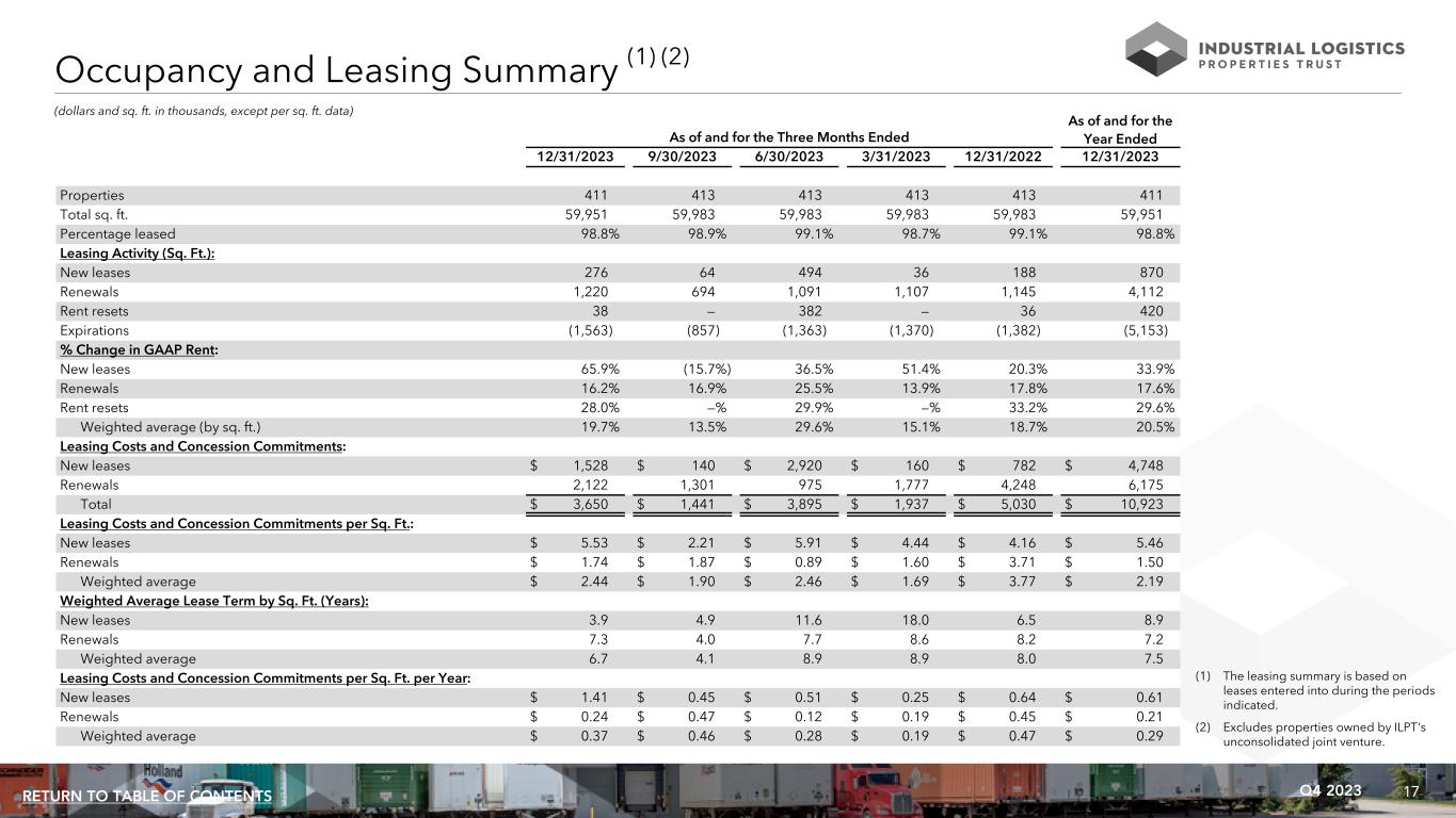 17Q4 2023RETURN TO TABLE OF CONTENTS (dollars and sq. ft. in thousands, except per sq. ft. data) As of and for the As of and for the Three Months Ended Year Ended 12/31/2023 9/30/2023 6/30/2023 3/31/2023 12/31/2022 12/31/2023 Properties 411 413 413 413 413 411 Total sq. ft. 59,951 59,983 59,983 59,983 59,983 59,951 Percentage leased 98.8% 98.9% 99.1% 98.7% 99.1% 98.8% Leasing Activity (Sq. Ft.): New leases 276 64 494 36 188 870 Renewals 1,220 694 1,091 1,107 1,145 4,112 Rent resets 38 — 382 — 36 420 Expirations (1,563) (857) (1,363) (1,370) (1,382) (5,153) % Change in GAAP Rent: New leases 65.9% (15.7%) 36.5% 51.4% 20.3% 33.9% Renewals 16.2% 16.9% 25.5% 13.9% 17.8% 17.6% Rent resets 28.0% —% 29.9% —% 33.2% 29.6% Weighted average (by sq. ft.) 19.7% 13.5% 29.6% 15.1% 18.7% 20.5% Leasing Costs and Concession Commitments: New leases $ 1,528 $ 140 $ 2,920 $ 160 $ 782 $ 4,748 Renewals 2,122 1,301 975 1,777 4,248 6,175 Total $ 3,650 $ 1,441 $ 3,895 $ 1,937 $ 5,030 $ 10,923 Leasing Costs and Concession Commitments per Sq. Ft.: New leases $ 5.53 $ 2.21 $ 5.91 $ 4.44 $ 4.16 $ 5.46 Renewals $ 1.74 $ 1.87 $ 0.89 $ 1.60 $ 3.71 $ 1.50 Weighted average $ 2.44 $ 1.90 $ 2.46 $ 1.69 $ 3.77 $ 2.19 Weighted Average Lease Term by Sq. Ft. (Years): New leases 3.9 4.9 11.6 18.0 6.5 8.9 Renewals 7.3 4.0 7.7 8.6 8.2 7.2 Weighted average 6.7 4.1 8.9 8.9 8.0 7.5 Leasing Costs and Concession Commitments per Sq. Ft. per Year: New leases $ 1.41 $ 0.45 $ 0.51 $ 0.25 $ 0.64 $ 0.61 Renewals $ 0.24 $ 0.47 $ 0.12 $ 0.19 $ 0.45 $ 0.21 Weighted average $ 0.37 $ 0.46 $ 0.28 $ 0.19 $ 0.47 $ 0.29 (1) The leasing summary is based on leases entered into during the periods indicated. (2) Excludes properties owned by ILPT's unconsolidated joint venture. Occupancy and Leasing Summary (1) (2)