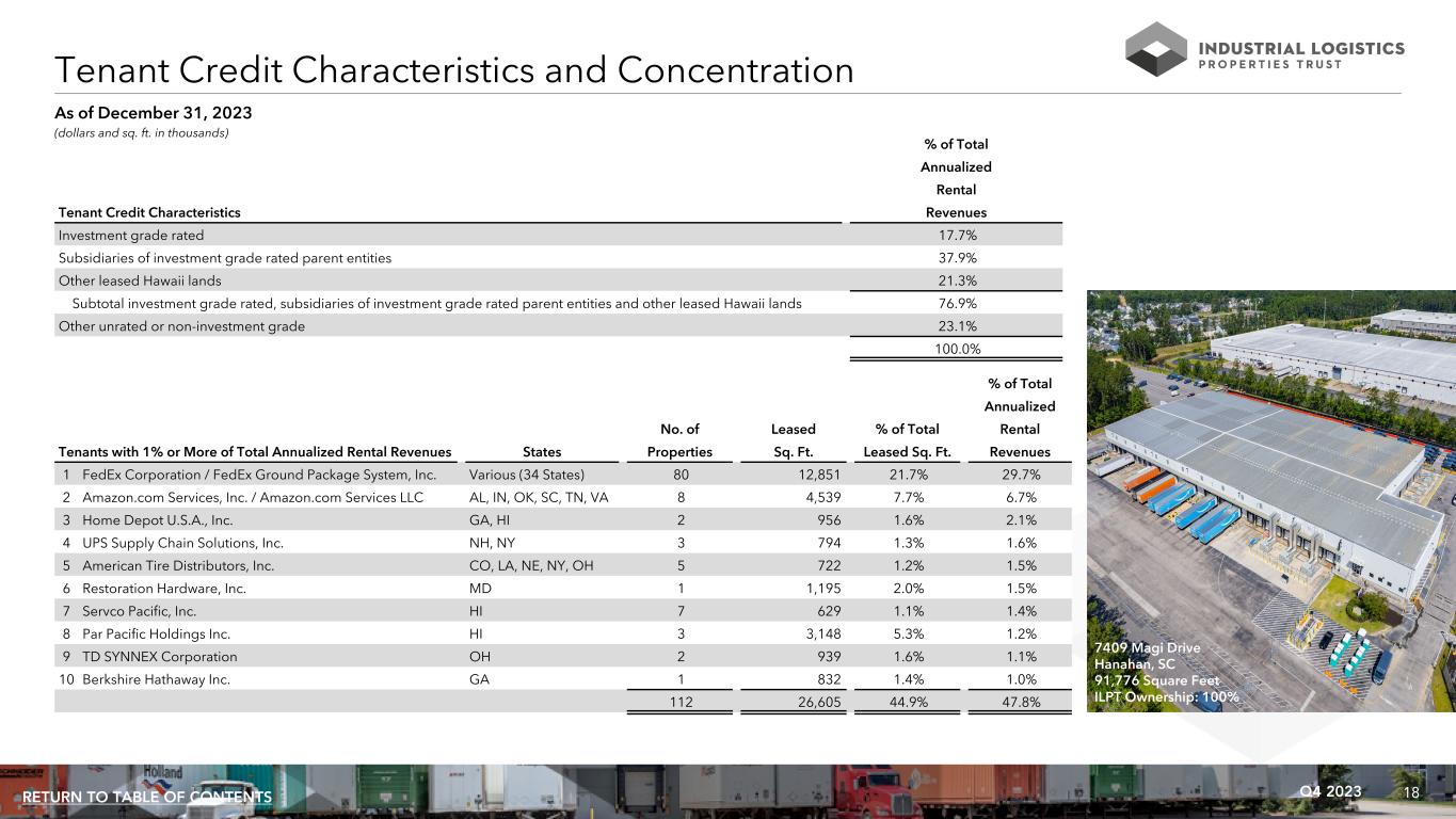 18Q4 2023RETURN TO TABLE OF CONTENTS As of December 31, 2023 % of Total Annualized Rental Tenant Credit Characteristics Revenues Investment grade rated 17.7% Subsidiaries of investment grade rated parent entities 37.9% Other leased Hawaii lands 21.3% Subtotal investment grade rated, subsidiaries of investment grade rated parent entities and other leased Hawaii lands 76.9% Other unrated or non-investment grade 23.1% 100.0% Tenant Credit Characteristics and Concentration % of Total Annualized No. of Leased % of Total Rental Tenants with 1% or More of Total Annualized Rental Revenues States Properties Sq. Ft. Leased Sq. Ft. Revenues 1 FedEx Corporation / FedEx Ground Package System, Inc. Various (34 States) 80 12,851 21.7% 29.7% 2 Amazon.com Services, Inc. / Amazon.com Services LLC AL, IN, OK, SC, TN, VA 8 4,539 7.7% 6.7% 3 Home Depot U.S.A., Inc. GA, HI 2 956 1.6% 2.1% 4 UPS Supply Chain Solutions, Inc. NH, NY 3 794 1.3% 1.6% 5 American Tire Distributors, Inc. CO, LA, NE, NY, OH 5 722 1.2% 1.5% 6 Restoration Hardware, Inc. MD 1 1,195 2.0% 1.5% 7 Servco Pacific, Inc. HI 7 629 1.1% 1.4% 8 Par Pacific Holdings Inc. HI 3 3,148 5.3% 1.2% 9 TD SYNNEX Corporation OH 2 939 1.6% 1.1% 10 Berkshire Hathaway Inc. GA 1 832 1.4% 1.0% 112 26,605 44.9% 47.8% (dollars and sq. ft. in thousands) 7409 Magi Drive Hanahan, SC 91,776 Square Feet ILPT Ownership: 100%