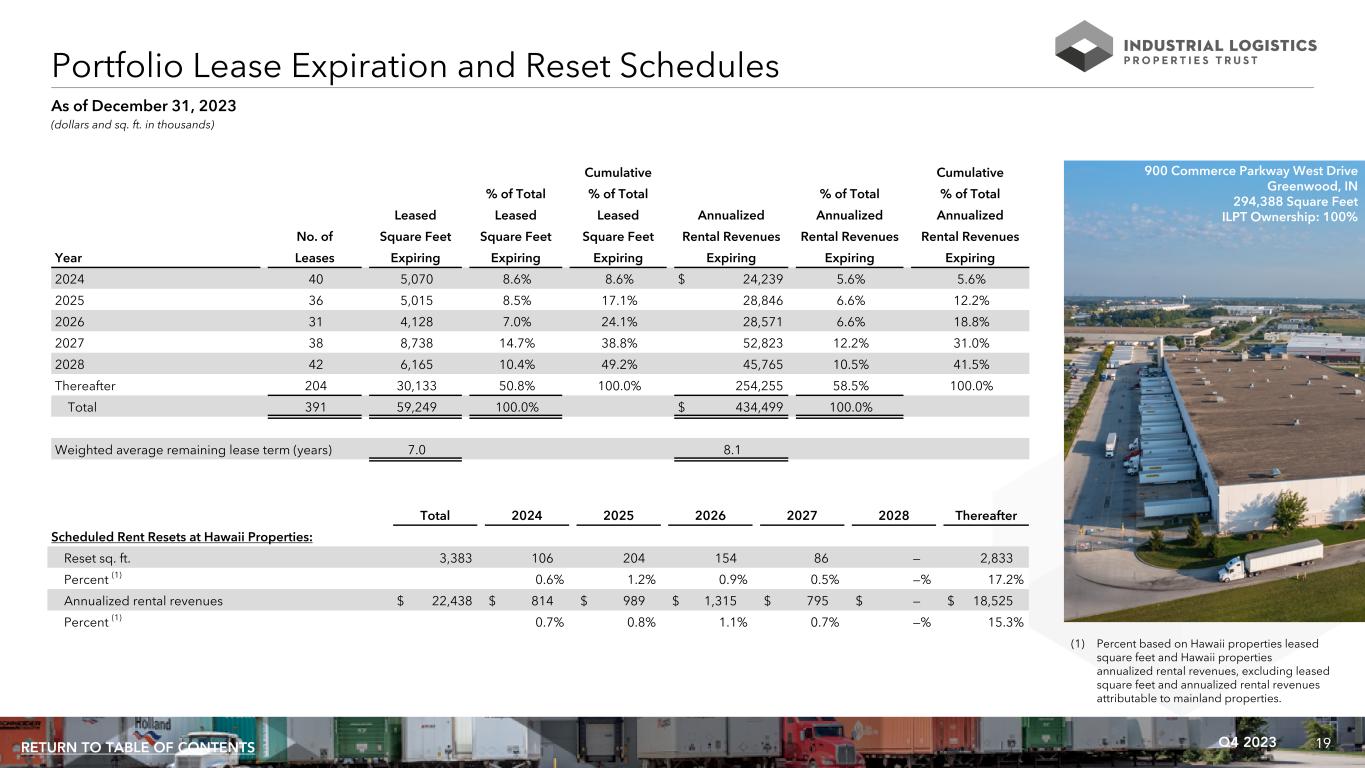 19Q4 2023RETURN TO TABLE OF CONTENTS Cumulative Cumulative % of Total % of Total % of Total % of Total Leased Leased Leased Annualized Annualized Annualized No. of Square Feet Square Feet Square Feet Rental Revenues Rental Revenues Rental Revenues Year Leases Expiring Expiring Expiring Expiring Expiring Expiring 2024 40 5,070 8.6% 8.6% $ 24,239 5.6% 5.6% 2025 36 5,015 8.5% 17.1% 28,846 6.6% 12.2% 2026 31 4,128 7.0% 24.1% 28,571 6.6% 18.8% 2027 38 8,738 14.7% 38.8% 52,823 12.2% 31.0% 2028 42 6,165 10.4% 49.2% 45,765 10.5% 41.5% Thereafter 204 30,133 50.8% 100.0% 254,255 58.5% 100.0% Total 391 59,249 100.0% $ 434,499 100.0% Weighted average remaining lease term (years) 7.0 8.1 Portfolio Lease Expiration and Reset Schedules (dollars and sq. ft. in thousands) As of December 31, 2023 Total 2024 2025 2026 2027 2028 Thereafter Scheduled Rent Resets at Hawaii Properties: Reset sq. ft. 3,383 106 204 154 86 — 2,833 Percent (1) 0.6% 1.2% 0.9% 0.5% —% 17.2% Annualized rental revenues $ 22,438 $ 814 $ 989 $ 1,315 $ 795 $ — $ 18,525 Percent (1) 0.7% 0.8% 1.1% 0.7% —% 15.3% (1) Percent based on Hawaii properties leased square feet and Hawaii properties annualized rental revenues, excluding leased square feet and annualized rental revenues attributable to mainland properties. 900 Commerce Parkway West Drive Greenwood, IN 294,388 Square Feet ILPT Ownership: 100%