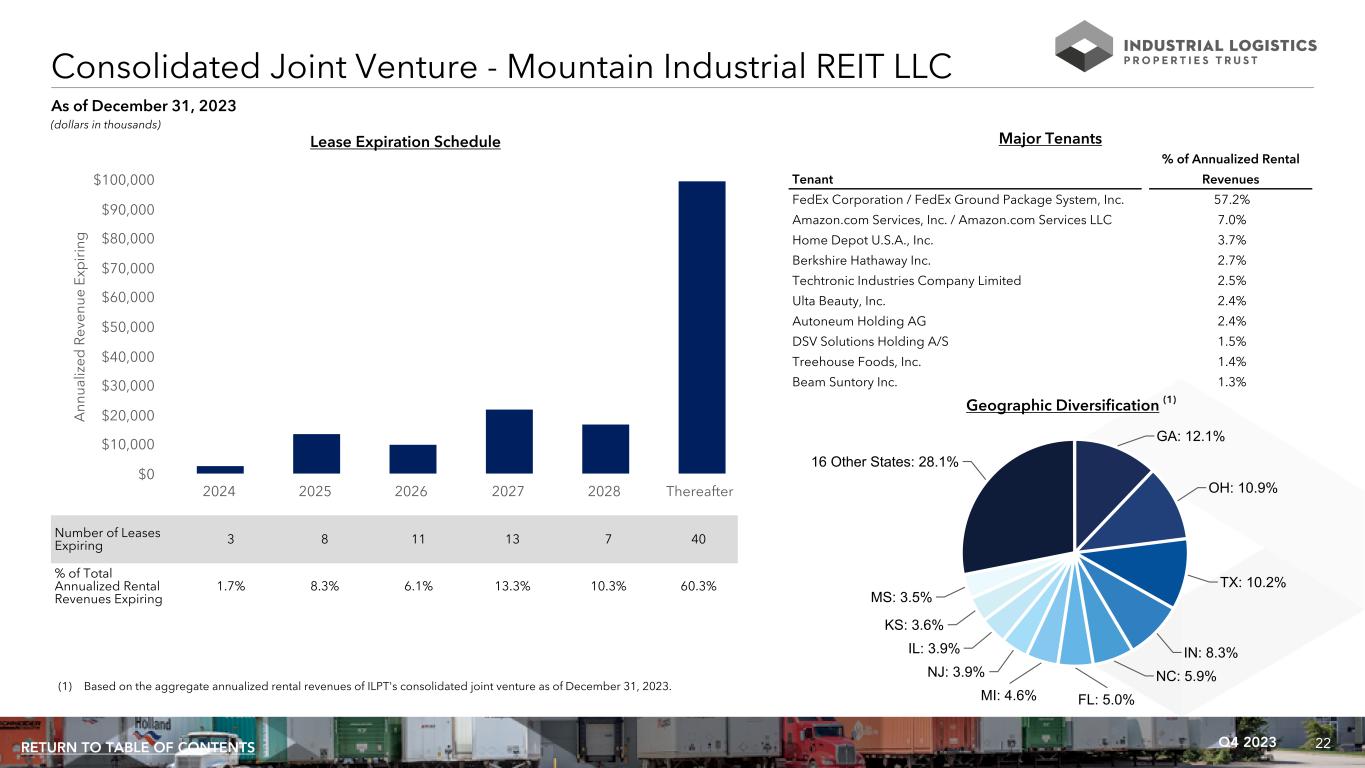 22Q4 2023RETURN TO TABLE OF CONTENTS GA: 12.1% OH: 10.9% TX: 10.2% IN: 8.3% NC: 5.9% FL: 5.0%MI: 4.6% NJ: 3.9% IL: 3.9% KS: 3.6% MS: 3.5% 16 Other States: 28.1% Consolidated Joint Venture - Mountain Industrial REIT LLC (dollars in thousands) Number of Leases Expiring 3 8 11 13 7 40 % of Total Annualized Rental Revenues Expiring 1.7% 8.3% 6.1% 13.3% 10.3% 60.3% A nn ua liz ed R ev en ue E xp ir in g 2024 2025 2026 2027 2028 Thereafter $0 $10,000 $20,000 $30,000 $40,000 $50,000 $60,000 $70,000 $80,000 $90,000 $100,000 Lease Expiration Schedule As of December 31, 2023 Major Tenants % of Annualized Rental Tenant Revenues FedEx Corporation / FedEx Ground Package System, Inc. 57.2% Amazon.com Services, Inc. / Amazon.com Services LLC 7.0% Home Depot U.S.A., Inc. 3.7% Berkshire Hathaway Inc. 2.7% Techtronic Industries Company Limited 2.5% Ulta Beauty, Inc. 2.4% Autoneum Holding AG 2.4% DSV Solutions Holding A/S 1.5% Treehouse Foods, Inc. 1.4% Beam Suntory Inc. 1.3% Geographic Diversification (1) (1) Based on the aggregate annualized rental revenues of ILPT's consolidated joint venture as of December 31, 2023.