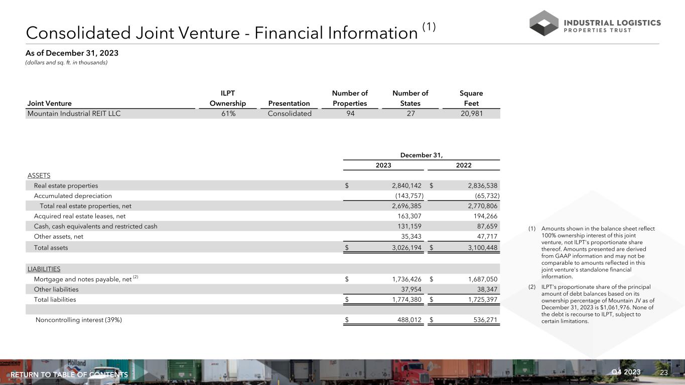 23Q4 2023RETURN TO TABLE OF CONTENTS Consolidated Joint Venture - Financial Information (1) (dollars and sq. ft. in thousands) ILPT Number of Number of Square Joint Venture Ownership Presentation Properties States Feet Mountain Industrial REIT LLC 61% Consolidated 94 27 20,981 (1) Amounts shown in the balance sheet reflect 100% ownership interest of this joint venture, not ILPT's proportionate share thereof. Amounts presented are derived from GAAP information and may not be comparable to amounts reflected in this joint venture's standalone financial information. (2) ILPT's proportionate share of the principal amount of debt balances based on its ownership percentage of Mountain JV as of December 31, 2023 is $1,061,976. None of the debt is recourse to ILPT, subject to certain limitations. As of December 31, 2023 December 31, 2023 2022 ASSETS Real estate properties $ 2,840,142 $ 2,836,538 Accumulated depreciation (143,757) (65,732) Total real estate properties, net 2,696,385 2,770,806 Acquired real estate leases, net 163,307 194,266 Cash, cash equivalents and restricted cash 131,159 87,659 Other assets, net 35,343 47,717 Total assets $ 3,026,194 $ 3,100,448 LIABILITIES Mortgage and notes payable, net (2) $ 1,736,426 $ 1,687,050 Other liabilities 37,954 38,347 Total liabilities $ 1,774,380 $ 1,725,397 Noncontrolling interest (39%) $ 488,012 $ 536,271