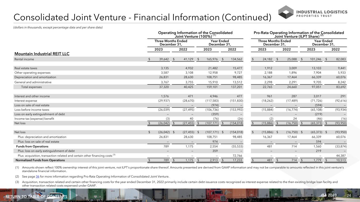 24Q4 2023RETURN TO TABLE OF CONTENTS Operating Information of the Consolidated Joint Venture (100%) (1) Pro-Rata Operating Information of the Consolidated Joint Venture (ILPT Share) (2) Three Months Ended December 31, Year Ended December 31, Three Months Ended December 31, Year Ended December 31, 2023 2022 2023 2022 2023 2022 2023 2022 Mountain Industrial REIT LLC Rental income $ 39,642 $ 41,129 $ 165,976 $ 134,562 $ 24,182 $ 25,088 $ 101,246 $ 82,083 Real estate taxes 3,135 4,932 21,482 15,477 1,912 3,009 13,103 9,441 Other operating expenses 3,587 3,108 12,958 9,727 2,188 1,896 7,904 5,933 Depreciation and amortization 26,831 28,630 108,751 98,485 16,367 17,464 66,339 60,076 General and administrative 3,767 3,755 15,910 13,512 2,298 2,291 9,705 8,242 Total expenses 37,320 40,425 159,101 137,201 22,765 24,660 97,051 83,692 Interest and other income 1,576 471 4,946 477 961 287 3,017 291 Interest expense (29,937) (28,670) (117,583) (151,830) (18,262) (17,489) (71,726) (92,616) Loss on sale of real estate — — (974) — — — (594) — Loss before income taxes (26,039) (27,495) (106,736) (153,992) (15,884) (16,774) (65,108) (93,934) Loss on early extinguishment of debt — — (359) — — — (219) — Income tax (expense) benefit (3) 40 (76) (26) (2) 24 (46) (16) Net loss $ (26,042) $ (27,455) $ (107,171) $ (154,018) $ (15,886) $ (16,750) $ (65,373) $ (93,950) Net loss $ (26,042) $ (27,455) $ (107,171) $ (154,018) $ (15,886) $ (16,750) $ (65,373) $ (93,950) Plus: depreciation and amortization 26,831 28,630 108,751 98,485 16,367 17,464 66,339 60,076 Plus: loss on sale of real estate — — 974 — — — 594 — Funds from Operations 789 1,175 2,554 (55,533) 481 714 1,560 (33,874) Plus: loss on early extinguishment of debt — — 359 — — — 219 — Plus: acquisition, transaction related and certain other financing costs (3) — — — 72,766 — — — 44,387 Normalized Funds from Operations $ 789 $ 1,175 $ 2,913 $ 17,233 $ 481 $ 714 $ 1,779 $ 10,513 (dollars in thousands, except percentage data and per share data) (1) Amounts shown reflect 100% ownership interest of this joint venture, not ILPT's proportionate share thereof. Amounts presented are derived from GAAP information and may not be comparable to amounts reflected in this joint venture's standalone financial information. (2) See page 36 for more information regarding Pro-Rata Operating Information of Consolidated Joint Venture. (3) Acquisition, transaction related and certain other financing costs for the year ended December 31, 2022 primarily include certain debt issuance costs recognized as interest expense related to the then existing bridge loan facility and other transaction related costs expensed under GAAP. Consolidated Joint Venture - Financial Information (Continued)