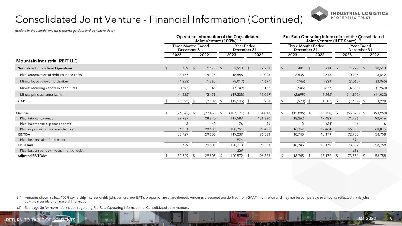 25Q4 2023RETURN TO TABLE OF CONTENTS Consolidated Joint Venture - Financial Information (Continued) Operating Information of the Consolidated Joint Venture (100%) (1) Pro-Rata Operating Information of the Consolidated Joint Venture (ILPT Share) (2) Three Months Ended December 31, Year Ended December 31, Three Months Ended December 31, Year Ended December 31, 2023 2022 2023 2022 2023 2022 2023 2022 Mountain Industrial REIT LLC Normalized Funds from Operations $ 789 $ 1,175 $ 2,913 $ 17,233 $ 481 $ 714 $ 1,779 $ 10,513 Plus: amortization of debt issuance costs 4,157 4,125 16,566 14,003 2,536 2,516 10,105 8,542 Minus: lease value amortization (1,223) (1,365) (5,017) (4,697) (746) (833) (3,060) (2,865) Minus: recurring capital expenditures (893) (1,045) (7,149) (3,182) (545) (637) (4,361) (1,940) Minus: principal amortization (4,425) (5,479) (19,508) (18,069) (2,699) (3,342) (11,900) (11,022) CAD $ (1,595) $ (2,589) $ (12,195) $ 5,288 $ (973) $ (1,582) $ (7,437) $ 3,228 Net loss $ (26,042) $ (27,455) $ (107,171) $ (154,018) $ (15,886) $ (16,750) $ (65,373) $ (93,950) Plus: interest expense 29,937 28,670 117,583 151,830 18,262 17,489 71,726 92,616 Plus: income tax expense (benefit) 3 (40) 76 26 2 (24) 46 16 Plus: depreciation and amortization 26,831 28,630 108,751 98,485 16,367 17,464 66,339 60,076 EBITDA 30,729 29,805 119,239 96,323 18,745 18,179 72,738 58,758 Plus: loss on sale of real estate — — 974 — — — 594 — EBITDAre 30,729 29,805 120,213 96,323 18,745 18,179 73,332 58,758 Plus: loss on early extinguishment of debt — — 359 — — — 219 — Adjusted EBITDAre $ 30,729 $ 29,805 $ 120,572 $ 96,323 $ 18,745 $ 18,179 $ 73,551 $ 58,758 (dollars in thousands, except percentage data and per share data) (1) Amounts shown reflect 100% ownership interest of this joint venture, not ILPT's proportionate share thereof. Amounts presented are derived from GAAP information and may not be comparable to amounts reflected in this joint venture's standalone financial information. (2) See page 36 for more information regarding Pro-Rata Operating Information of Consolidated Joint Venture.