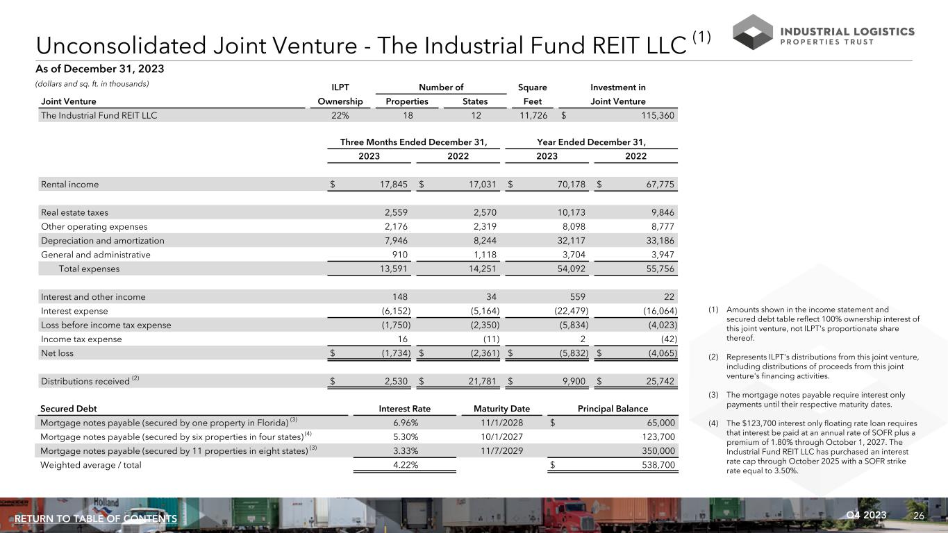 26Q4 2023RETURN TO TABLE OF CONTENTS Unconsolidated Joint Venture - The Industrial Fund REIT LLC (1) As of December 31, 2023 ILPT Number of Square Investment in Joint Venture Ownership Properties States Feet Joint Venture The Industrial Fund REIT LLC 22% 18 12 11,726 $ 115,360 Three Months Ended December 31, Year Ended December 31, 2023 2022 2023 2022 Rental income $ 17,845 $ 17,031 $ 70,178 $ 67,775 Real estate taxes 2,559 2,570 10,173 9,846 Other operating expenses 2,176 2,319 8,098 8,777 Depreciation and amortization 7,946 8,244 32,117 33,186 General and administrative 910 1,118 3,704 3,947 Total expenses 13,591 14,251 54,092 55,756 Interest and other income 148 34 559 22 Interest expense (6,152) (5,164) (22,479) (16,064) Loss before income tax expense (1,750) (2,350) (5,834) (4,023) Income tax expense 16 (11) 2 (42) Net loss $ (1,734) $ (2,361) $ (5,832) $ (4,065) Distributions received (2) $ 2,530 $ 21,781 $ 9,900 $ 25,742 Secured Debt Interest Rate Maturity Date Principal Balance Mortgage notes payable (secured by one property in Florida) (3) 6.96% 11/1/2028 $ 65,000 Mortgage notes payable (secured by six properties in four states) (4) 5.30% 10/1/2027 123,700 Mortgage notes payable (secured by 11 properties in eight states) (3) 3.33% 11/7/2029 350,000 Weighted average / total 4.22% $ 538,700 (1) Amounts shown in the income statement and secured debt table reflect 100% ownership interest of this joint venture, not ILPT's proportionate share thereof. (2) Represents ILPT's distributions from this joint venture, including distributions of proceeds from this joint venture's financing activities. (3) The mortgage notes payable require interest only payments until their respective maturity dates. (4) The $123,700 interest only floating rate loan requires that interest be paid at an annual rate of SOFR plus a premium of 1.80% through October 1, 2027. The Industrial Fund REIT LLC has purchased an interest rate cap through October 2025 with a SOFR strike rate equal to 3.50%. (dollars and sq. ft. in thousands)