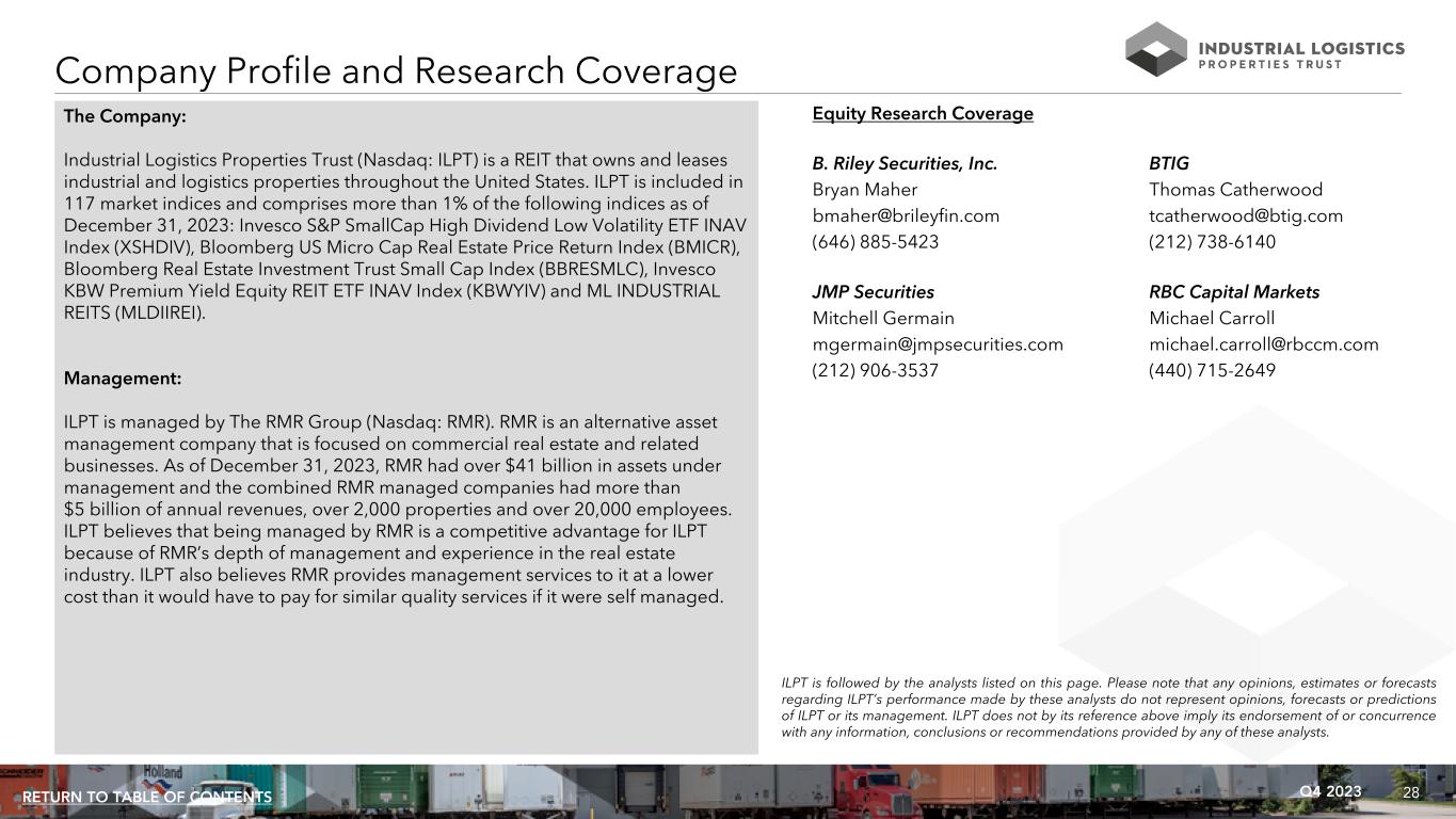 28Q4 2023RETURN TO TABLE OF CONTENTS Company Profile and Research Coverage The Company: Industrial Logistics Properties Trust (Nasdaq: ILPT) is a REIT that owns and leases industrial and logistics properties throughout the United States. ILPT is included in 117 market indices and comprises more than 1% of the following indices as of December 31, 2023: Invesco S&P SmallCap High Dividend Low Volatility ETF INAV Index (XSHDIV), Bloomberg US Micro Cap Real Estate Price Return Index (BMICR), Bloomberg Real Estate Investment Trust Small Cap Index (BBRESMLC), Invesco KBW Premium Yield Equity REIT ETF INAV Index (KBWYIV) and ML INDUSTRIAL REITS (MLDIIREI). Management: ILPT is managed by The RMR Group (Nasdaq: RMR). RMR is an alternative asset management company that is focused on commercial real estate and related businesses. As of December 31, 2023, RMR had over $41 billion in assets under management and the combined RMR managed companies had more than $5 billion of annual revenues, over 2,000 properties and over 20,000 employees. ILPT believes that being managed by RMR is a competitive advantage for ILPT because of RMR’s depth of management and experience in the real estate industry. ILPT also believes RMR provides management services to it at a lower cost than it would have to pay for similar quality services if it were self managed. Equity Research Coverage B. Riley Securities, Inc. BTIG Bryan Maher Thomas Catherwood bmaher@brileyfin.com tcatherwood@btig.com (646) 885-5423 (212) 738-6140 JMP Securities RBC Capital Markets Mitchell Germain Michael Carroll mgermain@jmpsecurities.com michael.carroll@rbccm.com (212) 906-3537 (440) 715-2649 ILPT is followed by the analysts listed on this page. Please note that any opinions, estimates or forecasts regarding ILPT’s performance made by these analysts do not represent opinions, forecasts or predictions of ILPT or its management. ILPT does not by its reference above imply its endorsement of or concurrence with any information, conclusions or recommendations provided by any of these analysts.