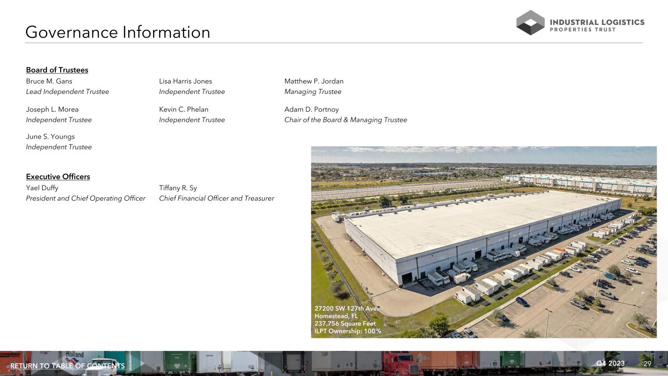 29Q4 2023RETURN TO TABLE OF CONTENTS Governance Information Board of Trustees Bruce M. Gans Lisa Harris Jones Matthew P. Jordan Lead Independent Trustee Independent Trustee Managing Trustee Joseph L. Morea Kevin C. Phelan Adam D. Portnoy Independent Trustee Independent Trustee Chair of the Board & Managing Trustee June S. Youngs Independent Trustee Executive Officers Yael Duffy Tiffany R. Sy President and Chief Operating Officer Chief Financial Officer and Treasurer 27200 SW 127th Ave. Homestead, FL 237,756 Square Feet ILPT Ownership: 100%