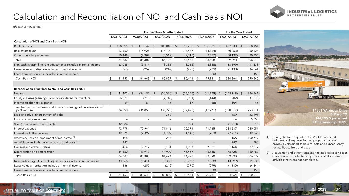 30Q4 2023RETURN TO TABLE OF CONTENTS Calculation and Reconciliation of NOI and Cash Basis NOI (dollars in thousands) For the Three Months Ended For the Year Ended 12/31/2023 9/30/2023 6/30/2023 3/31/2023 12/31/2022 12/31/2023 12/31/2022 Calculation of NOI and Cash Basis NOI: Rental income $ 108,895 $ 110,142 $ 108,043 $ 110,258 $ 106,339 $ 437,338 $ 388,151 Real estate taxes (13,560) (14,926) (15,100) (16,467) (14,164) (60,053) (50,624) Other operating expenses (10,448) (9,907) (8,519) (9,318) (8,577) (38,192) (30,855) NOI 84,887 85,309 84,424 84,473 83,598 339,093 306,672 Non-cash straight line rent adjustments included in rental income (3,068) (3,414) (3,355) (3,762) (3,368) (13,599) (11,538) Lease value amortization included in rental income (366) (252) (242) (270) (279) (1,130) (4,544) Lease termination fees included in rental income — — — — (20) — (50) Cash Basis NOI $ 81,453 $ 81,643 $ 80,827 $ 80,441 $ 79,931 $ 324,364 $ 290,540 Reconciliation of net loss to NOI and Cash Basis NOI: Net loss $ (41,402) $ (36,191) $ (36,580) $ (35,546) $ (41,759) $ (149,719) $ (286,841) Equity in losses (earnings) of unconsolidated joint venture 6,521 (719) (2,743) (3,961) (444) (902) (7,078) Income tax (benefit) expense (9) 51 45 17 (68) 104 45 Loss before income taxes and equity in earnings of unconsolidated joint venture (34,890) (36,859) (39,278) (39,490) (42,271) (150,517) (293,874) Loss on early extinguishment of debt — — 359 — — 359 22,198 Loss on equity securities — — — — — — 5,758 (Gain) loss on sale of real estate (2,684) — — 974 — (1,710) 10 Interest expense 72,979 72,941 71,846 70,771 71,765 288,537 280,051 Interest and other income (2,571) (2,397) (1,797) (1,146) (763) (7,911) (2,663) (Recovery) loss on impairment of real estate (1) (98) — 254 — — 156 100,747 Acquisition and other transaction related costs (2) 287 — — — — 287 586 General and administrative 7,414 7,712 8,131 7,907 7,981 31,164 32,877 Depreciation and amortization 44,450 43,912 44,909 45,457 46,886 178,728 160,982 NOI 84,887 85,309 84,424 84,473 83,598 339,093 306,672 Non-cash straight line rent adjustments included in rental income (3,068) (3,414) (3,355) (3,762) (3,368) (13,599) (11,538) Lease value amortization included in rental income (366) (252) (242) (270) (279) (1,130) (4,544) Lease termination fees included in rental income — — — — (20) — (50) Cash Basis NOI $ 81,453 $ 81,643 $ 80,827 $ 80,441 $ 79,931 $ 324,364 $ 290,540 11501 Wilkinson Drive El Paso, TX 144,199 Square Feet ILPT Ownership: 100% (1) During the fourth quarter of 2023, ILPT reversed estimated selling costs for one property that was previously classified as held for sale and subsequently reclassified to held and used. (2) Acquisition and other transaction related costs consist of costs related to potential acquisition and disposition activities that were not completed.