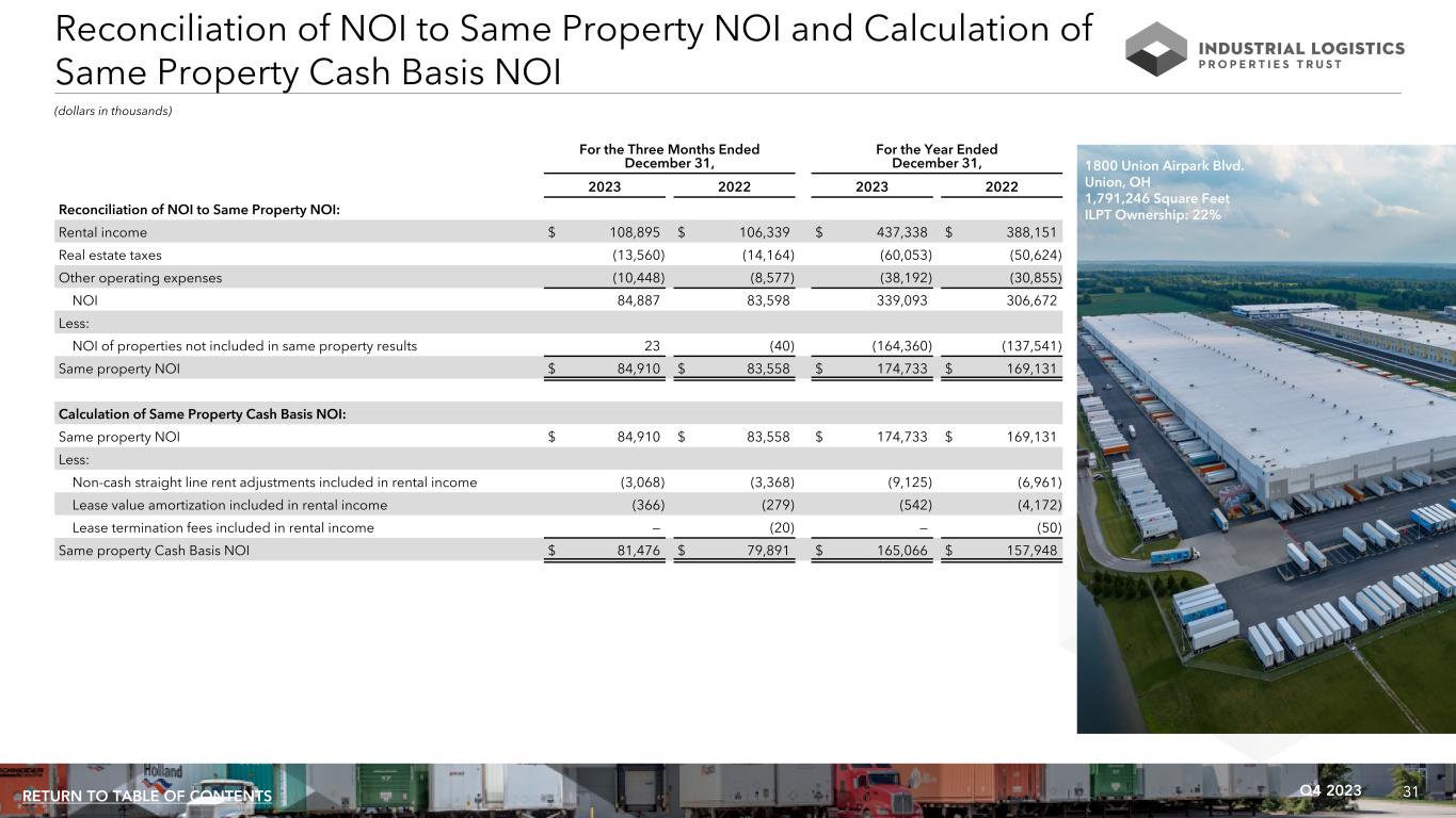 31Q4 2023RETURN TO TABLE OF CONTENTS Reconciliation of NOI to Same Property NOI and Calculation of Same Property Cash Basis NOI (dollars in thousands) For the Three Months Ended December 31, For the Year Ended December 31, 2023 2022 2023 2022 Reconciliation of NOI to Same Property NOI: Rental income $ 108,895 $ 106,339 $ 437,338 $ 388,151 Real estate taxes (13,560) (14,164) (60,053) (50,624) Other operating expenses (10,448) (8,577) (38,192) (30,855) NOI 84,887 83,598 339,093 306,672 Less: NOI of properties not included in same property results 23 (40) (164,360) (137,541) Same property NOI $ 84,910 $ 83,558 $ 174,733 $ 169,131 Calculation of Same Property Cash Basis NOI: Same property NOI $ 84,910 $ 83,558 $ 174,733 $ 169,131 Less: Non-cash straight line rent adjustments included in rental income (3,068) (3,368) (9,125) (6,961) Lease value amortization included in rental income (366) (279) (542) (4,172) Lease termination fees included in rental income — (20) — (50) Same property Cash Basis NOI $ 81,476 $ 79,891 $ 165,066 $ 157,948 1800 Union Airpark Blvd. Union, OH 1,791,246 Square Feet ILPT Ownership: 22%