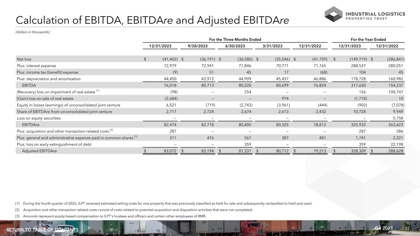 32Q4 2023RETURN TO TABLE OF CONTENTS Calculation of EBITDA, EBITDAre and Adjusted EBITDAre (dollars in thousands) For the Three Months Ended For the Year Ended 12/31/2023 9/30/2023 6/30/2023 3/31/2023 12/31/2022 12/31/2023 12/31/2022 Net loss $ (41,402) $ (36,191) $ (36,580) $ (35,546) $ (41,759) $ (149,719) $ (286,841) Plus: interest expense 72,979 72,941 71,846 70,771 71,765 288,537 280,051 Plus: income tax (benefit) expense (9) 51 45 17 (68) 104 45 Plus: depreciation and amortization 44,450 43,912 44,909 45,457 46,886 178,728 160,982 EBITDA 76,018 80,713 80,220 80,699 76,824 317,650 154,237 (Recovery) loss on impairment of real estate (1) (98) — 254 — — 156 100,747 (Gain) loss on sale of real estate (2,684) — — 974 — (1,710) 10 Equity in losses (earnings) of unconsolidated joint venture 6,521 (719) (2,743) (3,961) (444) (902) (7,078) Share of EBITDAre from unconsolidated joint venture 2,717 2,724 2,674 2,613 2,432 10,728 9,949 Loss on equity securities — — — — — — 5,758 EBITDAre 82,474 82,718 80,405 80,325 78,812 325,922 263,623 Plus: acquisition and other transaction related costs (2) 287 — — — — 287 586 Plus: general and administrative expense paid in common shares (3) 311 476 567 387 401 1,741 2,221 Plus: loss on early extinguishment of debt — — 359 — — 359 22,198 Adjusted EBITDAre $ 83,072 $ 83,194 $ 81,331 $ 80,712 $ 79,213 $ 328,309 $ 288,628 (1) During the fourth quarter of 2023, ILPT reversed estimated selling costs for one property that was previously classified as held for sale and subsequently reclassified to held and used. (2) Acquisition and other transaction related costs consist of costs related to potential acquisition and disposition activities that were not completed. (3) Amounts represent equity based compensation to ILPT's trustees and officers and certain other employees of RMR.