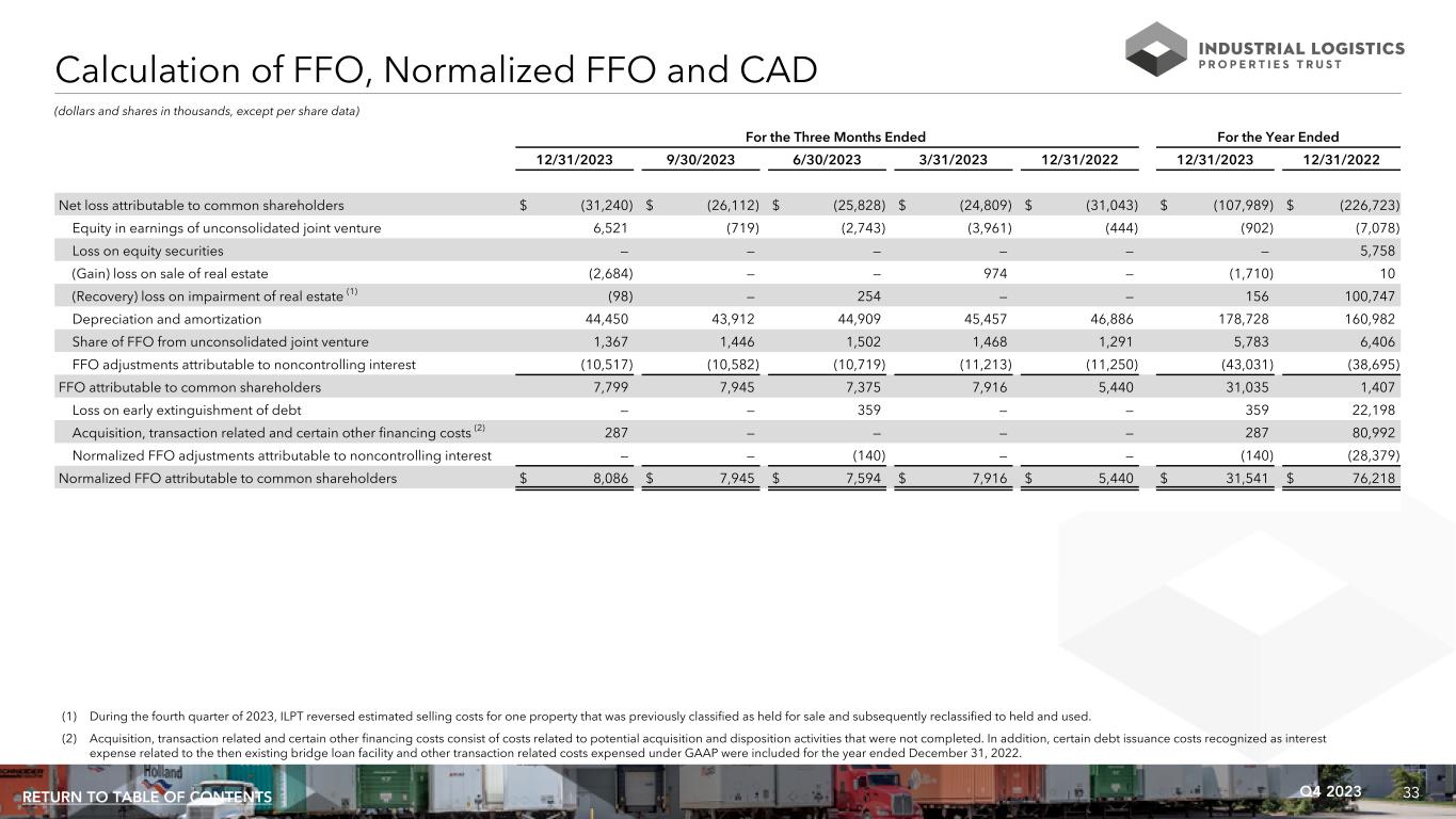 33Q4 2023RETURN TO TABLE OF CONTENTS Calculation of FFO, Normalized FFO and CAD (dollars and shares in thousands, except per share data) For the Three Months Ended For the Year Ended 12/31/2023 9/30/2023 6/30/2023 3/31/2023 12/31/2022 12/31/2023 12/31/2022 Net loss attributable to common shareholders $ (31,240) $ (26,112) $ (25,828) $ (24,809) $ (31,043) $ (107,989) $ (226,723) Equity in earnings of unconsolidated joint venture 6,521 (719) (2,743) (3,961) (444) (902) (7,078) Loss on equity securities — — — — — — 5,758 (Gain) loss on sale of real estate (2,684) — — 974 — (1,710) 10 (Recovery) loss on impairment of real estate (1) (98) — 254 — — 156 100,747 Depreciation and amortization 44,450 43,912 44,909 45,457 46,886 178,728 160,982 Share of FFO from unconsolidated joint venture 1,367 1,446 1,502 1,468 1,291 5,783 6,406 FFO adjustments attributable to noncontrolling interest (10,517) (10,582) (10,719) (11,213) (11,250) (43,031) (38,695) FFO attributable to common shareholders 7,799 7,945 7,375 7,916 5,440 31,035 1,407 Loss on early extinguishment of debt — — 359 — — 359 22,198 Acquisition, transaction related and certain other financing costs (2) 287 — — — — 287 80,992 Normalized FFO adjustments attributable to noncontrolling interest — — (140) — — (140) (28,379) Normalized FFO attributable to common shareholders $ 8,086 $ 7,945 $ 7,594 $ 7,916 $ 5,440 $ 31,541 $ 76,218 (1) During the fourth quarter of 2023, ILPT reversed estimated selling costs for one property that was previously classified as held for sale and subsequently reclassified to held and used. (2) Acquisition, transaction related and certain other financing costs consist of costs related to potential acquisition and disposition activities that were not completed. In addition, certain debt issuance costs recognized as interest expense related to the then existing bridge loan facility and other transaction related costs expensed under GAAP were included for the year ended December 31, 2022.