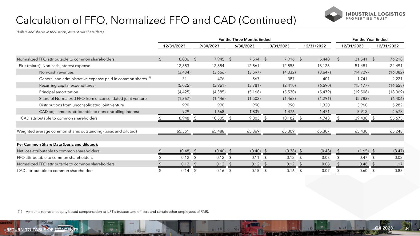 34Q4 2023RETURN TO TABLE OF CONTENTS (dollars and shares in thousands, except per share data) For the Three Months Ended For the Year Ended 12/31/2023 9/30/2023 6/30/2023 3/31/2023 12/31/2022 12/31/2023 12/31/2022 Normalized FFO attributable to common shareholders $ 8,086 $ 7,945 $ 7,594 $ 7,916 $ 5,440 $ 31,541 $ 76,218 Plus (minus): Non-cash interest expense 12,883 12,884 12,861 12,853 13,123 51,481 24,491 Non-cash revenues (3,434) (3,666) (3,597) (4,032) (3,647) (14,729) (16,082) General and administrative expense paid in common shares (1) 311 476 567 387 401 1,741 2,221 Recurring capital expenditures (5,025) (3,961) (3,781) (2,410) (6,590) (15,177) (16,658) Principal amortization (4,425) (4,385) (5,168) (5,530) (5,479) (19,508) (18,069) Share of Normalized FFO from unconsolidated joint venture (1,367) (1,446) (1,502) (1,468) (1,291) (5,783) (6,406) Distributions from unconsolidated joint venture 990 990 990 990 1,320 3,960 5,282 CAD adjustments attributable to noncontrolling interest 929 1,668 1,839 1,476 1,471 5,912 4,678 CAD attributable to common shareholders $ 8,948 $ 10,505 $ 9,803 $ 10,182 $ 4,748 $ 39,438 $ 55,675 Weighted average common shares outstanding (basic and diluted) 65,551 65,488 65,369 65,309 65,307 65,430 65,248 Per Common Share Data (basic and diluted): Net loss attributable to common shareholders $ (0.48) $ (0.40) $ (0.40) $ (0.38) $ (0.48) $ (1.65) $ (3.47) FFO attributable to common shareholders $ 0.12 $ 0.12 $ 0.11 $ 0.12 $ 0.08 $ 0.47 $ 0.02 Normalized FFO attributable to common shareholders $ 0.12 $ 0.12 $ 0.12 $ 0.12 $ 0.08 $ 0.48 $ 1.17 CAD attributable to common shareholders $ 0.14 $ 0.16 $ 0.15 $ 0.16 $ 0.07 $ 0.60 $ 0.85 Calculation of FFO, Normalized FFO and CAD (Continued) (1) Amounts represent equity based compensation to ILPT's trustees and officers and certain other employees of RMR.