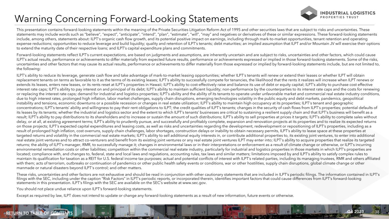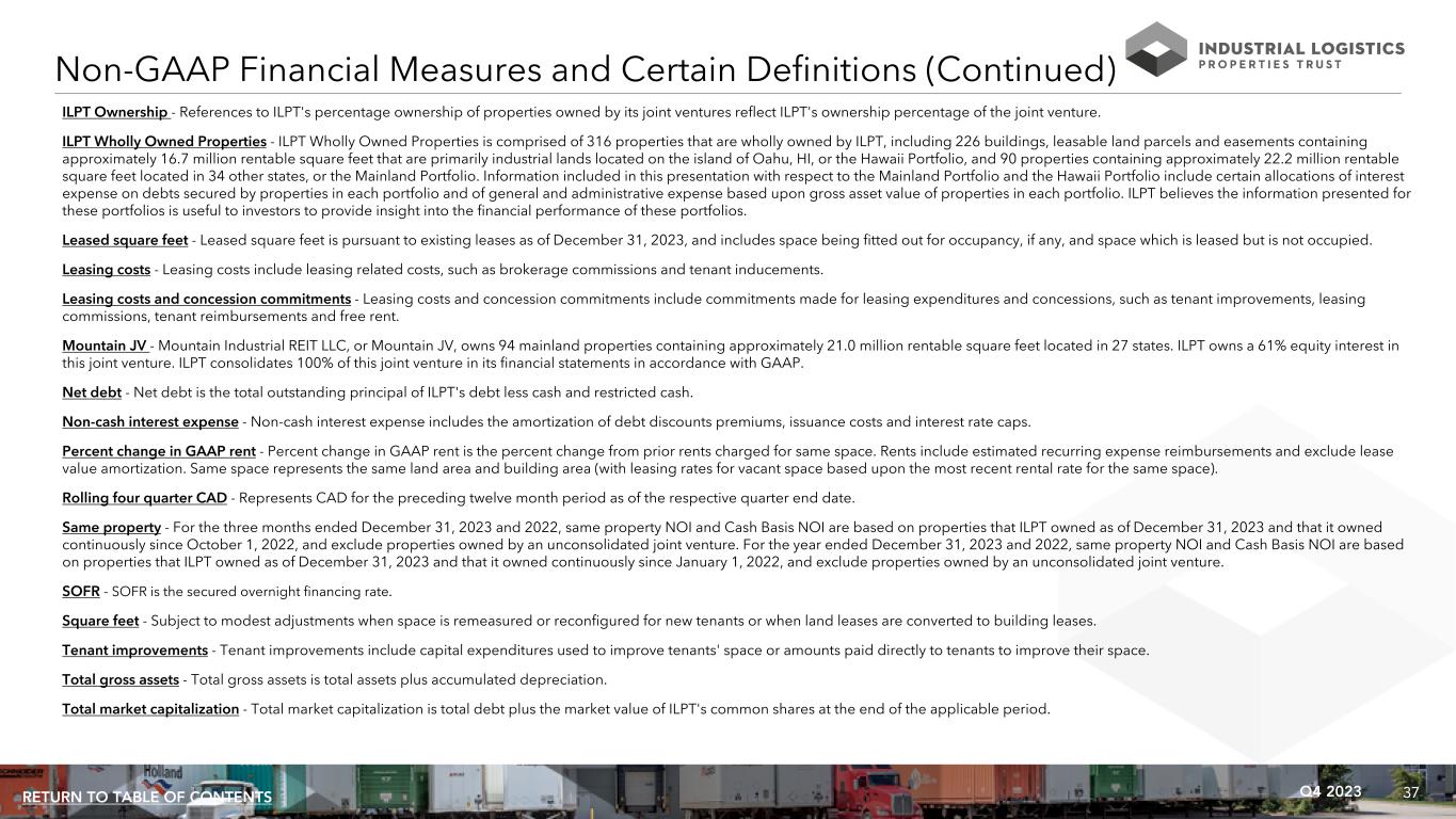 37Q4 2023RETURN TO TABLE OF CONTENTS ILPT Ownership - References to ILPT's percentage ownership of properties owned by its joint ventures reflect ILPT's ownership percentage of the joint venture. ILPT Wholly Owned Properties - ILPT Wholly Owned Properties is comprised of 316 properties that are wholly owned by ILPT, including 226 buildings, leasable land parcels and easements containing approximately 16.7 million rentable square feet that are primarily industrial lands located on the island of Oahu, HI, or the Hawaii Portfolio, and 90 properties containing approximately 22.2 million rentable square feet located in 34 other states, or the Mainland Portfolio. Information included in this presentation with respect to the Mainland Portfolio and the Hawaii Portfolio include certain allocations of interest expense on debts secured by properties in each portfolio and of general and administrative expense based upon gross asset value of properties in each portfolio. ILPT believes the information presented for these portfolios is useful to investors to provide insight into the financial performance of these portfolios. Leased square feet - Leased square feet is pursuant to existing leases as of December 31, 2023, and includes space being fitted out for occupancy, if any, and space which is leased but is not occupied. Leasing costs - Leasing costs include leasing related costs, such as brokerage commissions and tenant inducements. Leasing costs and concession commitments - Leasing costs and concession commitments include commitments made for leasing expenditures and concessions, such as tenant improvements, leasing commissions, tenant reimbursements and free rent. Mountain JV - Mountain Industrial REIT LLC, or Mountain JV, owns 94 mainland properties containing approximately 21.0 million rentable square feet located in 27 states. ILPT owns a 61% equity interest in this joint venture. ILPT consolidates 100% of this joint venture in its financial statements in accordance with GAAP. Net debt - Net debt is the total outstanding principal of ILPT's debt less cash and restricted cash. Non-cash interest expense - Non-cash interest expense includes the amortization of debt discounts premiums, issuance costs and interest rate caps. Percent change in GAAP rent - Percent change in GAAP rent is the percent change from prior rents charged for same space. Rents include estimated recurring expense reimbursements and exclude lease value amortization. Same space represents the same land area and building area (with leasing rates for vacant space based upon the most recent rental rate for the same space). Rolling four quarter CAD - Represents CAD for the preceding twelve month period as of the respective quarter end date. Same property - For the three months ended December 31, 2023 and 2022, same property NOI and Cash Basis NOI are based on properties that ILPT owned as of December 31, 2023 and that it owned continuously since October 1, 2022, and exclude properties owned by an unconsolidated joint venture. For the year ended December 31, 2023 and 2022, same property NOI and Cash Basis NOI are based on properties that ILPT owned as of December 31, 2023 and that it owned continuously since January 1, 2022, and exclude properties owned by an unconsolidated joint venture. SOFR - SOFR is the secured overnight financing rate. Square feet - Subject to modest adjustments when space is remeasured or reconfigured for new tenants or when land leases are converted to building leases. Tenant improvements - Tenant improvements include capital expenditures used to improve tenants' space or amounts paid directly to tenants to improve their space. Total gross assets - Total gross assets is total assets plus accumulated depreciation. Total market capitalization - Total market capitalization is total debt plus the market value of ILPT's common shares at the end of the applicable period. Non-GAAP Financial Measures and Certain Definitions (Continued)