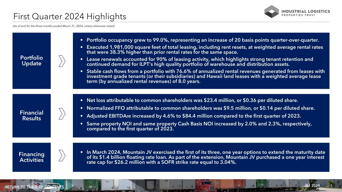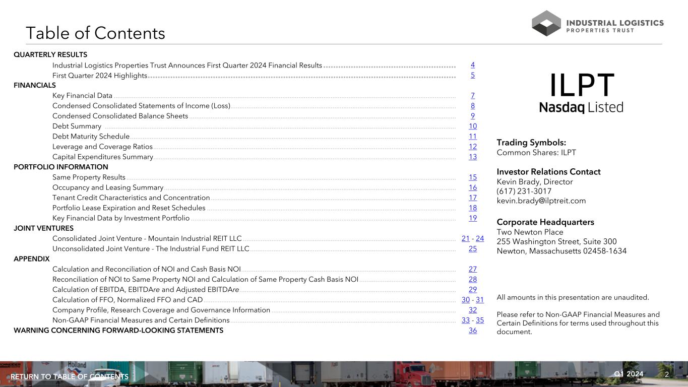 2Q1 2024RETURN TO TABLE OF CONTENTS QUARTERLY RESULTS Industrial Logistics Properties Trust Announces First Quarter 2024 Financial Results ..................................................... 4 First Quarter 2024 Highlights ........................................................................................................................... 5 FINANCIALS Key Financial Data ............................................................................................................................................................................................... 7 Condensed Consolidated Statements of Income (Loss) .............................................................................................................................. 8 Condensed Consolidated Balance Sheets ..................................................................................................................................................... 9 Debt Summary .................................................................................................................................................................................................... 10 Debt Maturity Schedule ...................................................................................................................................................................................... 11 Leverage and Coverage Ratios ......................................................................................................................................................................... 12 Capital Expenditures Summary ......................................................................................................................................................................... 13 PORTFOLIO INFORMATION Same Property Results ........................................................................................................................................................................................ 15 Occupancy and Leasing Summary ................................................................................................................................................................... 16 Tenant Credit Characteristics and Concentration ......................................................................................................................................... 17 Portfolio Lease Expiration and Reset Schedules ........................................................................................................................................... 18 Key Financial Data by Investment Portfolio .................................................................................................................................................... 19 JOINT VENTURES Consolidated Joint Venture - Mountain Industrial REIT LLC ....................................................................................................................... 21 - 24 Unconsolidated Joint Venture - The Industrial Fund REIT LLC ................................................................................................................... 25 APPENDIX Calculation and Reconciliation of NOI and Cash Basis NOI ........................................................................................................................ 27 Reconciliation of NOI to Same Property NOI and Calculation of Same Property Cash Basis NOI ...................................................... 28 Calculation of EBITDA, EBITDAre and Adjusted EBITDAre ......................................................................................................................... 29 Calculation of FFO, Normalized FFO and CAD ............................................................................................................................................. 30 - 31 Company Profile, Research Coverage and Governance Information ....................................................................................................... 32 Non-GAAP Financial Measures and Certain Definitions .............................................................................................................................. 33 - 35 WARNING CONCERNING FORWARD-LOOKING STATEMENTS 36 Table of Contents All amounts in this presentation are unaudited. Please refer to Non-GAAP Financial Measures and Certain Definitions for terms used throughout this document. Trading Symbols: Common Shares: ILPT Investor Relations Contact Kevin Brady, Director (617) 231-3017 kevin.brady@ilptreit.com Corporate Headquarters Two Newton Place 255 Washington Street, Suite 300 Newton, Massachusetts 02458-1634