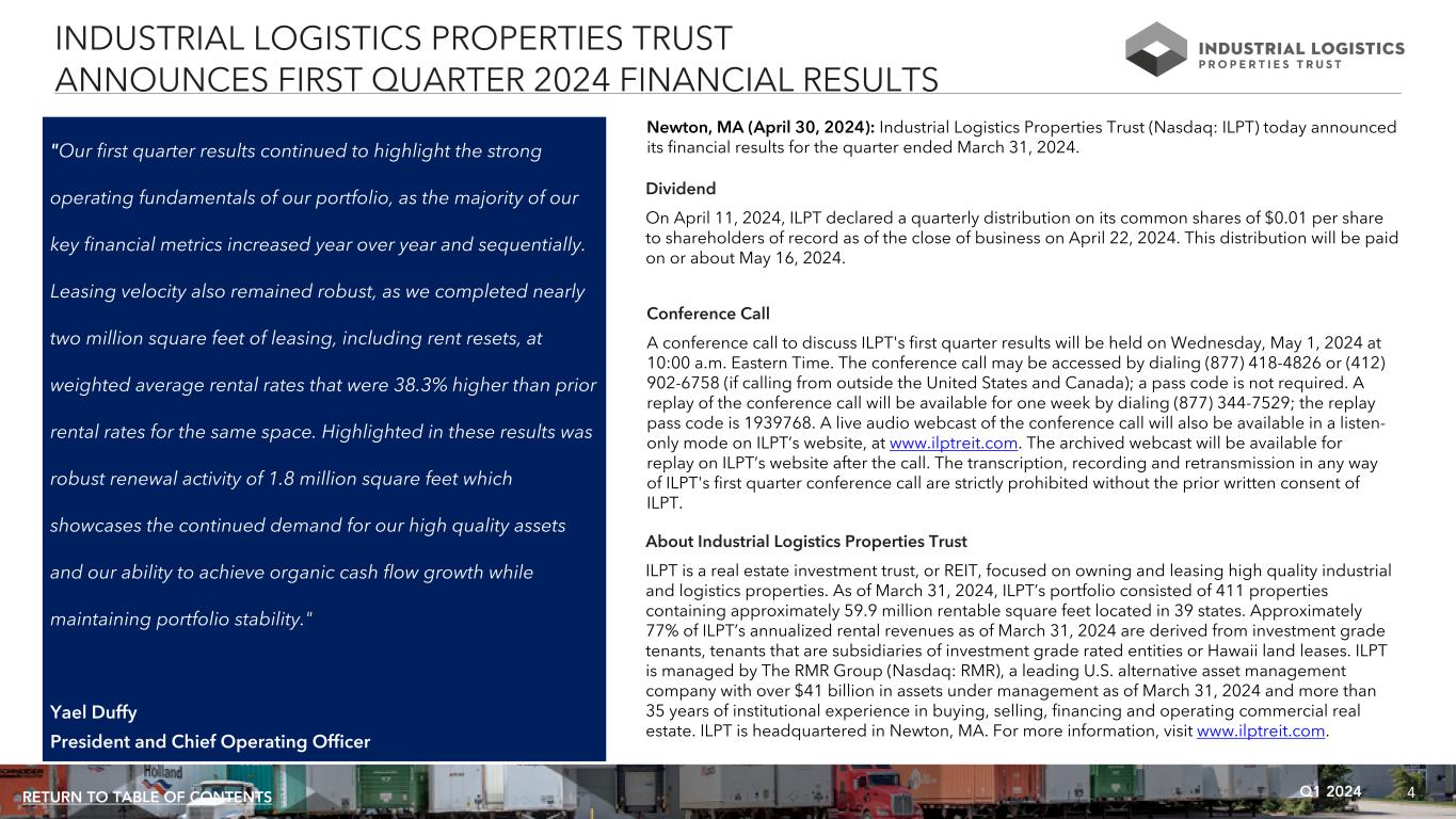 4Q1 2024RETURN TO TABLE OF CONTENTS "Our first quarter results continued to highlight the strong operating fundamentals of our portfolio, as the majority of our key financial metrics increased year over year and sequentially. Leasing velocity also remained robust, as we completed nearly two million square feet of leasing, including rent resets, at weighted average rental rates that were 38.3% higher than prior rental rates for the same space. Highlighted in these results was robust renewal activity of 1.8 million square feet which showcases the continued demand for our high quality assets and our ability to achieve organic cash flow growth while maintaining portfolio stability." Yael Duffy President and Chief Operating Officer INDUSTRIAL LOGISTICS PROPERTIES TRUST ANNOUNCES FIRST QUARTER 2024 FINANCIAL RESULTS Newton, MA (April 30, 2024): Industrial Logistics Properties Trust (Nasdaq: ILPT) today announced its financial results for the quarter ended March 31, 2024. Dividend On April 11, 2024, ILPT declared a quarterly distribution on its common shares of $0.01 per share to shareholders of record as of the close of business on April 22, 2024. This distribution will be paid on or about May 16, 2024. Conference Call A conference call to discuss ILPT's first quarter results will be held on Wednesday, May 1, 2024 at 10:00 a.m. Eastern Time. The conference call may be accessed by dialing (877) 418-4826 or (412) 902-6758 (if calling from outside the United States and Canada); a pass code is not required. A replay of the conference call will be available for one week by dialing (877) 344-7529; the replay pass code is 1939768. A live audio webcast of the conference call will also be available in a listen- only mode on ILPT’s website, at www.ilptreit.com. The archived webcast will be available for replay on ILPT’s website after the call. The transcription, recording and retransmission in any way of ILPT's first quarter conference call are strictly prohibited without the prior written consent of ILPT. About Industrial Logistics Properties Trust ILPT is a real estate investment trust, or REIT, focused on owning and leasing high quality industrial and logistics properties. As of March 31, 2024, ILPT’s portfolio consisted of 411 properties containing approximately 59.9 million rentable square feet located in 39 states. Approximately 77% of ILPT’s annualized rental revenues as of March 31, 2024 are derived from investment grade tenants, tenants that are subsidiaries of investment grade rated entities or Hawaii land leases. ILPT is managed by The RMR Group (Nasdaq: RMR), a leading U.S. alternative asset management company with over $41 billion in assets under management as of March 31, 2024 and more than 35 years of institutional experience in buying, selling, financing and operating commercial real estate. ILPT is headquartered in Newton, MA. For more information, visit www.ilptreit.com.