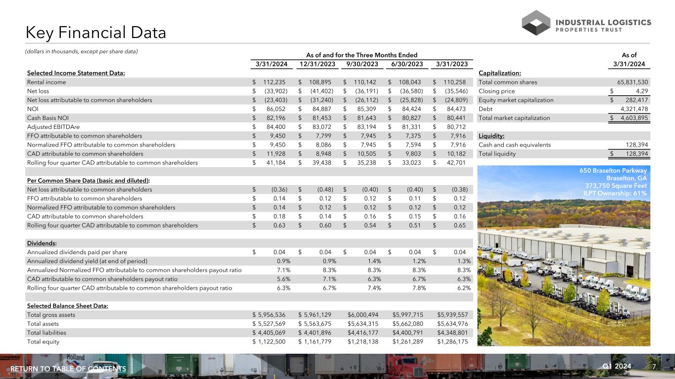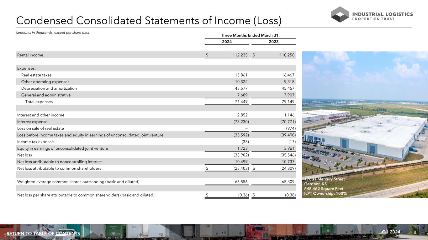 7Q1 2024RETURN TO TABLE OF CONTENTS As of and for the Three Months Ended As of 3/31/2024 12/31/2023 9/30/2023 6/30/2023 3/31/2023 3/31/2024 Selected Income Statement Data: Capitalization: Rental income $ 112,235 $ 108,895 $ 110,142 $ 108,043 $ 110,258 Total common shares 65,831,530 Net loss $ (33,902) $ (41,402) $ (36,191) $ (36,580) $ (35,546) Closing price $ 4.29 Net loss attributable to common shareholders $ (23,403) $ (31,240) $ (26,112) $ (25,828) $ (24,809) Equity market capitalization $ 282,417 NOI $ 86,052 $ 84,887 $ 85,309 $ 84,424 $ 84,473 Debt 4,321,478 Cash Basis NOI $ 82,196 $ 81,453 $ 81,643 $ 80,827 $ 80,441 Total market capitalization $ 4,603,895 Adjusted EBITDAre $ 84,400 $ 83,072 $ 83,194 $ 81,331 $ 80,712 FFO attributable to common shareholders $ 9,450 $ 7,799 $ 7,945 $ 7,375 $ 7,916 Liquidity: Normalized FFO attributable to common shareholders $ 9,450 $ 8,086 $ 7,945 $ 7,594 $ 7,916 Cash and cash equivalents 128,394 CAD attributable to common shareholders $ 11,928 $ 8,948 $ 10,505 $ 9,803 $ 10,182 Total liquidity $ 128,394 Rolling four quarter CAD attributable to common shareholders $ 41,184 $ 39,438 $ 35,238 $ 33,023 $ 42,701 Per Common Share Data (basic and diluted): Net loss attributable to common shareholders $ (0.36) $ (0.48) $ (0.40) $ (0.40) $ (0.38) FFO attributable to common shareholders $ 0.14 $ 0.12 $ 0.12 $ 0.11 $ 0.12 Normalized FFO attributable to common shareholders $ 0.14 $ 0.12 $ 0.12 $ 0.12 $ 0.12 CAD attributable to common shareholders $ 0.18 $ 0.14 $ 0.16 $ 0.15 $ 0.16 Rolling four quarter CAD attributable to common shareholders $ 0.63 $ 0.60 $ 0.54 $ 0.51 $ 0.65 Dividends: Annualized dividends paid per share $ 0.04 $ 0.04 $ 0.04 $ 0.04 $ 0.04 Annualized dividend yield (at end of period) 0.9% 0.9% 1.4% 1.2% 1.3% Annualized Normalized FFO attributable to common shareholders payout ratio 7.1% 8.3% 8.3% 8.3% 8.3% CAD attributable to common shareholders payout ratio 5.6% 7.1% 6.3% 6.7% 6.3% Rolling four quarter CAD attributable to common shareholders payout ratio 6.3% 6.7% 7.4% 7.8% 6.2% Selected Balance Sheet Data: Total gross assets $ 5,956,536 $ 5,961,129 $6,000,494 $5,997,715 $5,939,557 Total assets $ 5,527,569 $ 5,563,675 $5,634,315 $5,662,080 $5,634,976 Total liabilities $ 4,405,069 $ 4,401,896 $4,416,177 $4,400,791 $4,348,801 Total equity $ 1,122,500 $ 1,161,779 $1,218,138 $1,261,289 $1,286,175 (dollars in thousands, except per share data) Key Financial Data 650 Braselton Parkway Braselton, GA 373,750 Square Feet ILPT Ownership: 61%