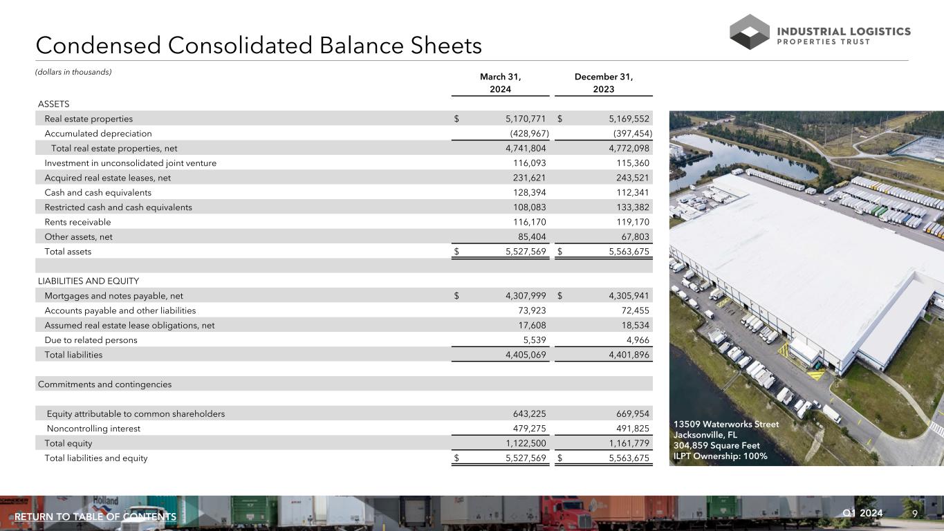 8Q1 2024RETURN TO TABLE OF CONTENTS Condensed Consolidated Statements of Income (Loss) Three Months Ended March 31, 2024 2023 Rental income $ 112,235 $ 110,258 Expenses: Real estate taxes 15,861 16,467 Other operating expenses 10,322 9,318 Depreciation and amortization 43,577 45,457 General and administrative 7,689 7,907 Total expenses 77,449 79,149 Interest and other income 2,852 1,146 Interest expense (73,230) (70,771) Loss on sale of real estate — (974) Loss before income taxes and equity in earnings of unconsolidated joint venture (35,592) (39,490) Income tax expense (33) (17) Equity in earnings of unconsolidated joint venture 1,723 3,961 Net loss (33,902) (35,546) Net loss attributable to noncontrolling interest 10,499 10,737 Net loss attributable to common shareholders $ (23,403) $ (24,809) Weighted average common shares outstanding (basic and diluted) 65,556 65,309 Net loss per share attributable to common shareholders (basic and diluted) $ (0.36) $ (0.38) (amounts in thousands, except per share data) 17001 Mercury Street Gardner, KS 645,462 Square Feet ILPT Ownership: 100%