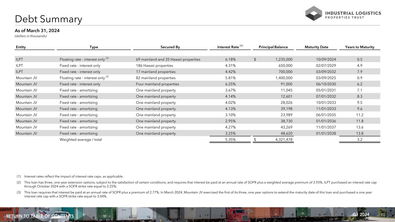 10Q1 2024RETURN TO TABLE OF CONTENTS (1) Interest rates reflect the impact of interest rate caps, as applicable. (2) This loan has three, one year extension options, subject to the satisfaction of certain conditions, and requires that interest be paid at an annual rate of SOFR plus a weighted average premium of 3.93%. ILPT purchased an interest rate cap through October 2024 with a SOFR strike rate equal to 2.25%. (3) This loan requires that interest be paid at an annual rate of SOFR plus a premium of 2.77%. In March 2024, Mountain JV exercised the first of its three, one year options to extend the maturity date of this loan and purchased a one year interest rate cap with a SOFR strike rate equal to 3.04%. Entity Type Secured By Interest Rate (1) Principal Balance Maturity Date Years to Maturity ILPT Floating rate - interest only (2) 69 mainland and 35 Hawaii properties 6.18% $ 1,235,000 10/09/2024 0.5 ILPT Fixed rate - interest only 186 Hawaii properties 4.31% 650,000 02/07/2029 4.9 ILPT Fixed rate - interest only 17 mainland properties 4.42% 700,000 03/09/2032 7.9 Mountain JV Floating rate - interest only (3) 82 mainland properties 5.81% 1,400,000 03/09/2025 0.9 Mountain JV Fixed rate - interest only Four mainland properties 6.25% 91,000 06/10/2030 6.2 Mountain JV Fixed rate - amortizing One mainland property 3.67% 11,045 05/01/2031 7.1 Mountain JV Fixed rate - amortizing One mainland property 4.14% 12,601 07/01/2032 8.3 Mountain JV Fixed rate - amortizing One mainland property 4.02% 28,026 10/01/2033 9.5 Mountain JV Fixed rate - amortizing One mainland property 4.13% 39,198 11/01/2033 9.6 Mountain JV Fixed rate - amortizing One mainland property 3.10% 23,989 06/01/2035 11.2 Mountain JV Fixed rate - amortizing One mainland property 2.95% 38,730 01/01/2036 11.8 Mountain JV Fixed rate - amortizing One mainland property 4.27% 43,269 11/01/2037 13.6 Mountain JV Fixed rate - amortizing One mainland property 3.25% 48,620 01/01/2038 13.8 Weighted average / total 5.35% $ 4,321,478 3.2 Debt Summary (dollars in thousands) As of March 31, 2024