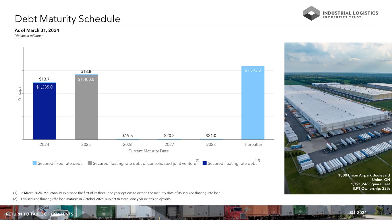 11Q1 2024RETURN TO TABLE OF CONTENTS (1) In March 2024, Mountain JV exercised the first of its three, one year options to extend the maturity date of its secured floating rate loan. (2) This secured floating rate loan matures in October 2024, subject to three, one year extension options. Debt Maturity Schedule (dollars in millions) As of March 31, 2024 Current Maturity Date Pr in ci p al $1,235.0 $1,400.0$13.7 $18.8 $19.5 $20.2 $21.0 $1,593.3 Secured fixed rate debt Secured floating rate debt of consolidated joint venture Secured floating rate debt 2024 2025 2026 2027 2028 Thereafter (1) (2) 1800 Union Airpark Boulevard Union, OH 1,791,246 Square Feet ILPT Ownership: 22%