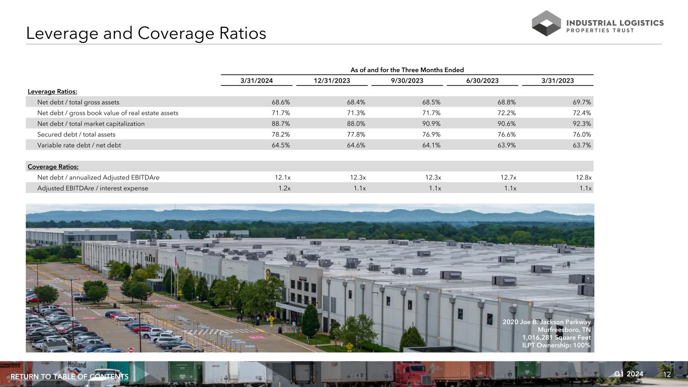 12Q1 2024RETURN TO TABLE OF CONTENTS As of and for the Three Months Ended 3/31/2024 12/31/2023 9/30/2023 6/30/2023 3/31/2023 Leverage Ratios: Net debt / total gross assets 68.6% 68.4% 68.5% 68.8% 69.7% Net debt / gross book value of real estate assets 71.7% 71.3% 71.7% 72.2% 72.4% Net debt / total market capitalization 88.7% 88.0% 90.9% 90.6% 92.3% Secured debt / total assets 78.2% 77.8% 76.9% 76.6% 76.0% Variable rate debt / net debt 64.5% 64.6% 64.1% 63.9% 63.7% Coverage Ratios: Net debt / annualized Adjusted EBITDAre 12.1x 12.3x 12.3x 12.7x 12.8x Adjusted EBITDAre / interest expense 1.2x 1.1x 1.1x 1.1x 1.1x Leverage and Coverage Ratios 2020 Joe B. Jackson Parkway Murfreesboro, TN 1,016,281 Square Feet ILPT Ownership: 100%