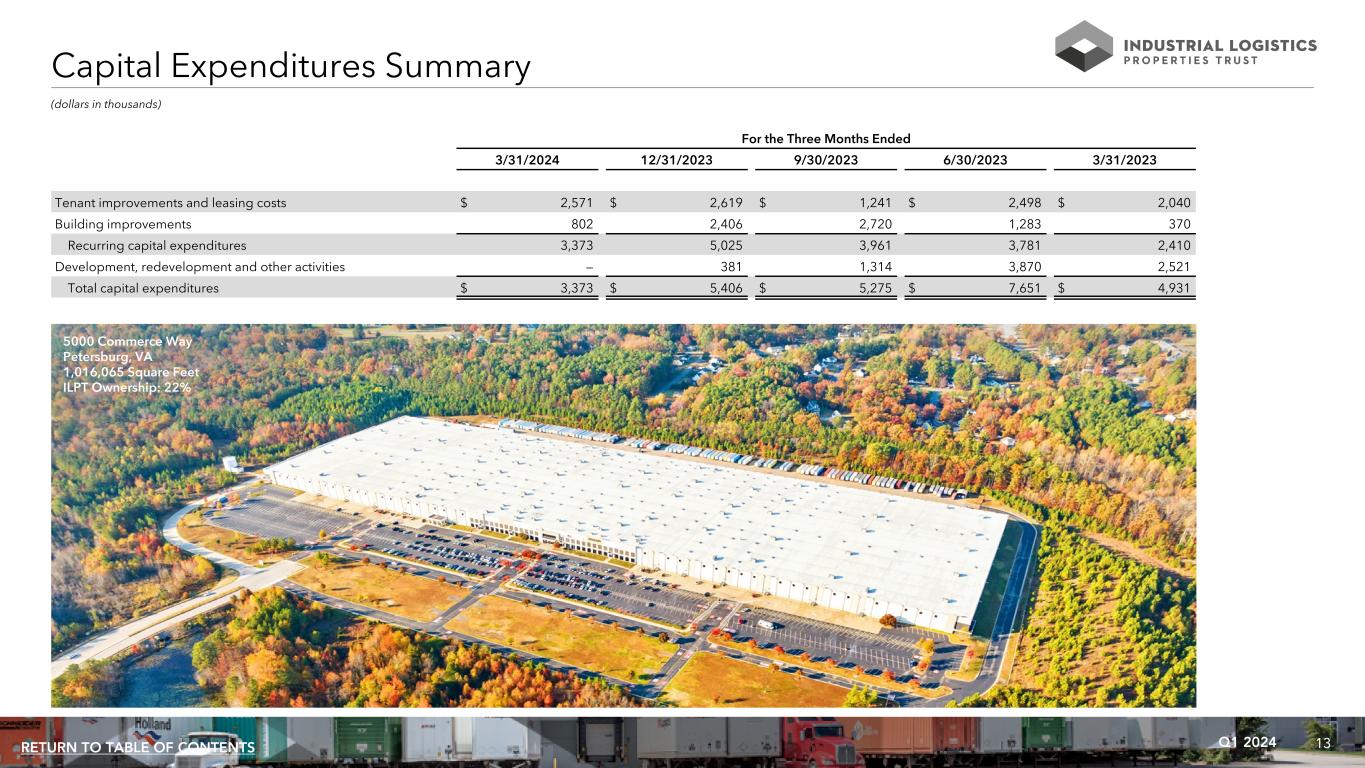 13Q1 2024RETURN TO TABLE OF CONTENTS (dollars in thousands) For the Three Months Ended 3/31/2024 12/31/2023 9/30/2023 6/30/2023 3/31/2023 Tenant improvements and leasing costs $ 2,571 $ 2,619 $ 1,241 $ 2,498 $ 2,040 Building improvements 802 2,406 2,720 1,283 370 Recurring capital expenditures 3,373 5,025 3,961 3,781 2,410 Development, redevelopment and other activities — 381 1,314 3,870 2,521 Total capital expenditures $ 3,373 $ 5,406 $ 5,275 $ 7,651 $ 4,931 Capital Expenditures Summary 5000 Commerce Way Petersburg, VA 1,016,065 Square Feet ILPT Ownership: 22%