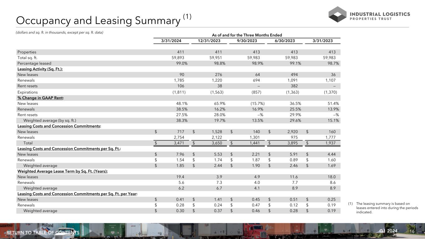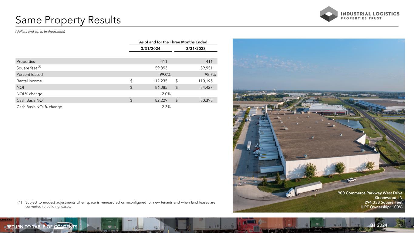 15Q1 2024RETURN TO TABLE OF CONTENTS (dollars and sq. ft. in thousands) As of and for the Three Months Ended 3/31/2024 3/31/2023 Properties 411 411 Square feet (1) 59,893 59,951 Percent leased 99.0% 98.7% Rental income $ 112,235 $ 110,195 NOI $ 86,085 $ 84,427 NOI % change 2.0% Cash Basis NOI $ 82,229 $ 80,395 Cash Basis NOI % change 2.3% Same Property Results 900 Commerce Parkway West Drive Greenwood, IN 294,338 Square Feet ILPT Ownership: 100% (1) Subject to modest adjustments when space is remeasured or reconfigured for new tenants and when land leases are converted to building leases.