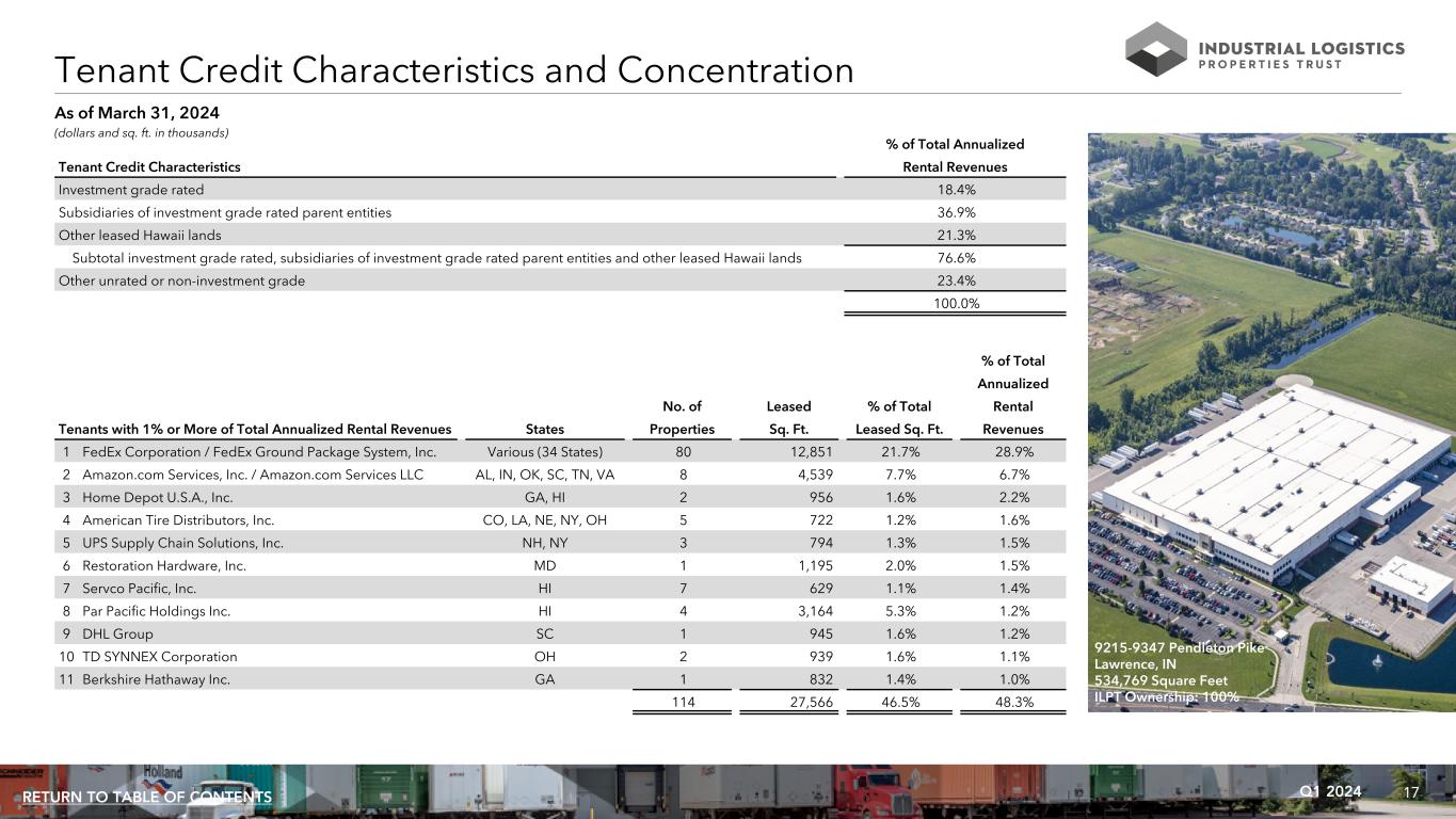 17Q1 2024RETURN TO TABLE OF CONTENTS As of March 31, 2024 % of Total Annualized Tenant Credit Characteristics Rental Revenues Investment grade rated 18.4% Subsidiaries of investment grade rated parent entities 36.9% Other leased Hawaii lands 21.3% Subtotal investment grade rated, subsidiaries of investment grade rated parent entities and other leased Hawaii lands 76.6% Other unrated or non-investment grade 23.4% 100.0% Tenant Credit Characteristics and Concentration % of Total Annualized No. of Leased % of Total Rental Tenants with 1% or More of Total Annualized Rental Revenues States Properties Sq. Ft. Leased Sq. Ft. Revenues 1 FedEx Corporation / FedEx Ground Package System, Inc. Various (34 States) 80 12,851 21.7% 28.9% 2 Amazon.com Services, Inc. / Amazon.com Services LLC AL, IN, OK, SC, TN, VA 8 4,539 7.7% 6.7% 3 Home Depot U.S.A., Inc. GA, HI 2 956 1.6% 2.2% 4 American Tire Distributors, Inc. CO, LA, NE, NY, OH 5 722 1.2% 1.6% 5 UPS Supply Chain Solutions, Inc. NH, NY 3 794 1.3% 1.5% 6 Restoration Hardware, Inc. MD 1 1,195 2.0% 1.5% 7 Servco Pacific, Inc. HI 7 629 1.1% 1.4% 8 Par Pacific Holdings Inc. HI 4 3,164 5.3% 1.2% 9 DHL Group SC 1 945 1.6% 1.2% 10 TD SYNNEX Corporation OH 2 939 1.6% 1.1% 11 Berkshire Hathaway Inc. GA 1 832 1.4% 1.0% 114 27,566 46.5% 48.3% (dollars and sq. ft. in thousands) 9215-9347 Pendleton Pike Lawrence, IN 534,769 Square Feet ILPT Ownership: 100%