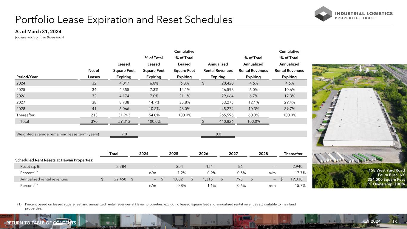 18Q1 2024RETURN TO TABLE OF CONTENTS Cumulative Cumulative % of Total % of Total % of Total % of Total Leased Leased Leased Annualized Annualized Annualized No. of Square Feet Square Feet Square Feet Rental Revenues Rental Revenues Rental Revenues Period/Year Leases Expiring Expiring Expiring Expiring Expiring Expiring 2024 32 4,017 6.8% 6.8% $ 20,420 4.6% 4.6% 2025 34 4,355 7.3% 14.1% 26,598 6.0% 10.6% 2026 32 4,174 7.0% 21.1% 29,664 6.7% 17.3% 2027 38 8,738 14.7% 35.8% 53,275 12.1% 29.4% 2028 41 6,066 10.2% 46.0% 45,274 10.3% 39.7% Thereafter 213 31,963 54.0% 100.0% 265,595 60.3% 100.0% Total 390 59,313 100.0% $ 440,826 100.0% Weighted average remaining lease term (years) 7.0 8.0 Portfolio Lease Expiration and Reset Schedules (dollars and sq. ft. in thousands) As of March 31, 2024 Total 2024 2025 2026 2027 2028 Thereafter Scheduled Rent Resets at Hawaii Properties: Reset sq. ft. 3,384 — 204 154 86 — 2,940 Percent (1) n/m 1.2% 0.9% 0.5% n/m 17.7% Annualized rental revenues $ 22,450 $ — $ 1,002 $ 1,315 $ 795 $ — $ 19,338 Percent (1) n/m 0.8% 1.1% 0.6% n/m 15.7% (1) Percent based on leased square feet and annualized rental revenues at Hawaii properties, excluding leased square feet and annualized rental revenues attributable to mainland properties. 158 West Yard Road Feura Bush, NY 354,000 Square Feet ILPT Ownership: 100%