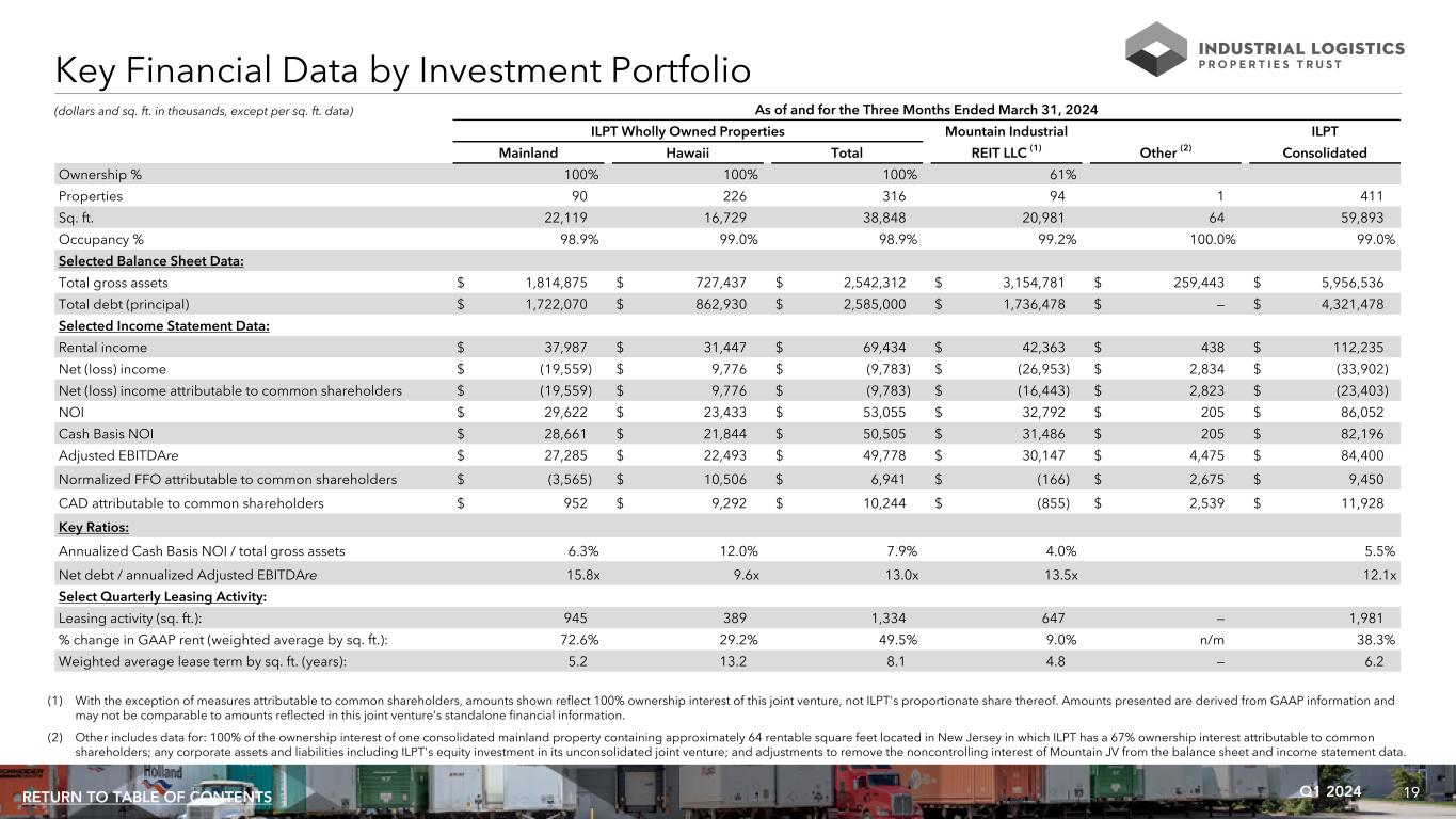 19Q1 2024RETURN TO TABLE OF CONTENTS (dollars and sq. ft. in thousands, except per sq. ft. data) Key Financial Data by Investment Portfolio As of and for the Three Months Ended March 31, 2024 ILPT Wholly Owned Properties Mountain Industrial ILPT Mainland Hawaii Total REIT LLC (1) Other (2) Consolidated Ownership % 100% 100% 100% 61% Properties 90 226 316 94 1 411 Sq. ft. 22,119 16,729 38,848 20,981 64 59,893 Occupancy % 98.9% 99.0% 98.9% 99.2% 100.0% 99.0% Selected Balance Sheet Data: Total gross assets $ 1,814,875 $ 727,437 $ 2,542,312 $ 3,154,781 $ 259,443 $ 5,956,536 Total debt (principal) $ 1,722,070 $ 862,930 $ 2,585,000 $ 1,736,478 $ — $ 4,321,478 Selected Income Statement Data: Rental income $ 37,987 $ 31,447 $ 69,434 $ 42,363 $ 438 $ 112,235 Net (loss) income $ (19,559) $ 9,776 $ (9,783) $ (26,953) $ 2,834 $ (33,902) Net (loss) income attributable to common shareholders $ (19,559) $ 9,776 $ (9,783) $ (16,443) $ 2,823 $ (23,403) NOI $ 29,622 $ 23,433 $ 53,055 $ 32,792 $ 205 $ 86,052 Cash Basis NOI $ 28,661 $ 21,844 $ 50,505 $ 31,486 $ 205 $ 82,196 Adjusted EBITDAre $ 27,285 $ 22,493 $ 49,778 $ 30,147 $ 4,475 $ 84,400 Normalized FFO attributable to common shareholders $ (3,565) $ 10,506 $ 6,941 $ (166) $ 2,675 $ 9,450 CAD attributable to common shareholders $ 952 $ 9,292 $ 10,244 $ (855) $ 2,539 $ 11,928 Key Ratios: Annualized Cash Basis NOI / total gross assets 6.3% 12.0% 7.9% 4.0% 5.5% Net debt / annualized Adjusted EBITDAre 15.8x 9.6x 13.0x 13.5x 12.1x Select Quarterly Leasing Activity: Leasing activity (sq. ft.): 945 389 1,334 647 — 1,981 % change in GAAP rent (weighted average by sq. ft.): 72.6% 29.2% 49.5% 9.0% n/m 38.3% Weighted average lease term by sq. ft. (years): 5.2 13.2 8.1 4.8 — 6.2 (1) With the exception of measures attributable to common shareholders, amounts shown reflect 100% ownership interest of this joint venture, not ILPT's proportionate share thereof. Amounts presented are derived from GAAP information and may not be comparable to amounts reflected in this joint venture's standalone financial information. (2) Other includes data for: 100% of the ownership interest of one consolidated mainland property containing approximately 64 rentable square feet located in New Jersey in which ILPT has a 67% ownership interest attributable to common shareholders; any corporate assets and liabilities including ILPT's equity investment in its unconsolidated joint venture; and adjustments to remove the noncontrolling interest of Mountain JV from the balance sheet and income statement data.