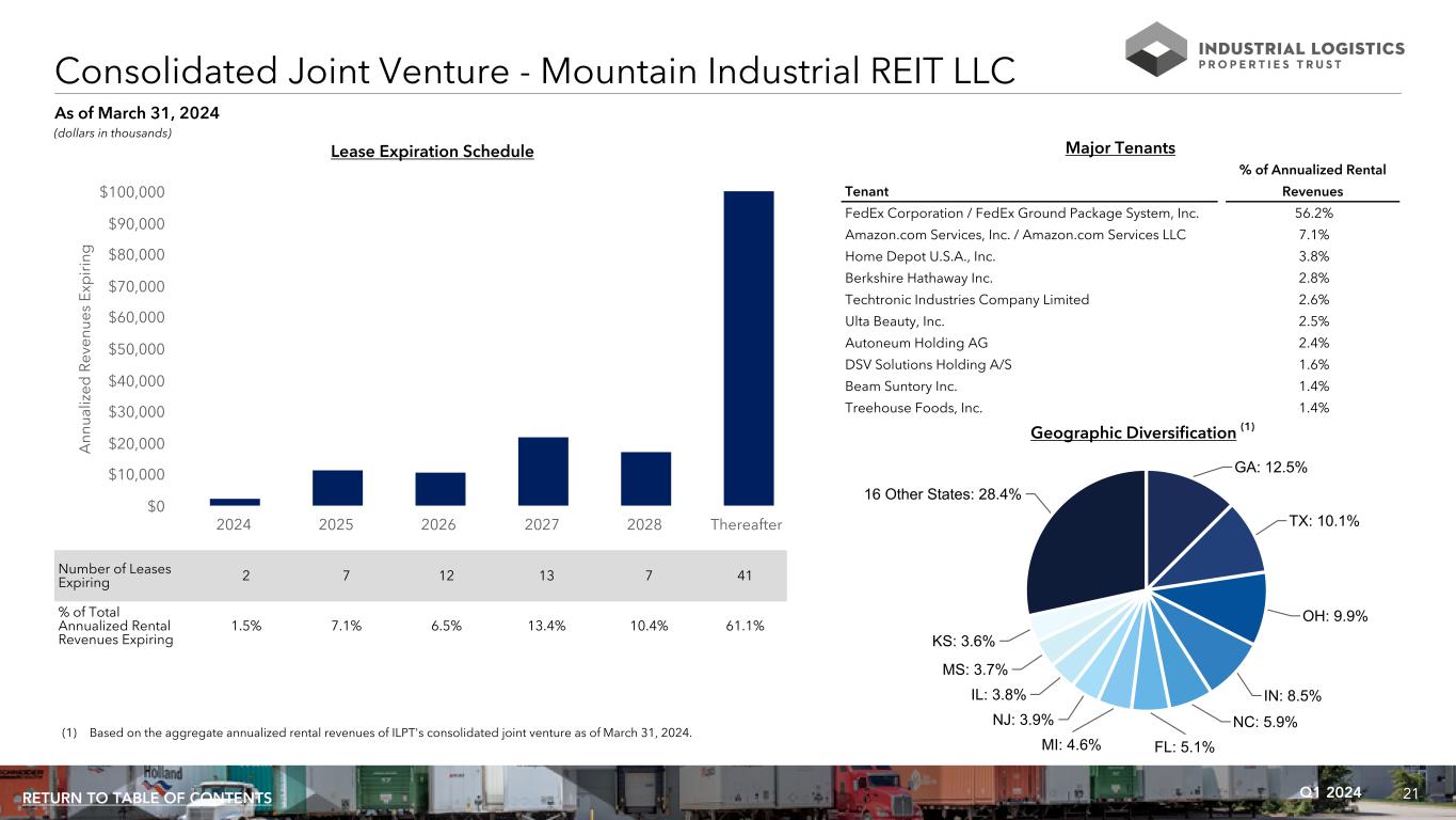21Q1 2024RETURN TO TABLE OF CONTENTS GA: 12.5% TX: 10.1% OH: 9.9% IN: 8.5% NC: 5.9% FL: 5.1%MI: 4.6% NJ: 3.9% IL: 3.8% MS: 3.7% KS: 3.6% 16 Other States: 28.4% Consolidated Joint Venture - Mountain Industrial REIT LLC (dollars in thousands) Number of Leases Expiring 2 7 12 13 7 41 % of Total Annualized Rental Revenues Expiring 1.5% 7.1% 6.5% 13.4% 10.4% 61.1% A nn ua liz ed R ev en ue s Ex p ir in g 2024 2025 2026 2027 2028 Thereafter $0 $10,000 $20,000 $30,000 $40,000 $50,000 $60,000 $70,000 $80,000 $90,000 $100,000 Lease Expiration Schedule As of March 31, 2024 Major Tenants % of Annualized Rental Tenant Revenues FedEx Corporation / FedEx Ground Package System, Inc. 56.2% Amazon.com Services, Inc. / Amazon.com Services LLC 7.1% Home Depot U.S.A., Inc. 3.8% Berkshire Hathaway Inc. 2.8% Techtronic Industries Company Limited 2.6% Ulta Beauty, Inc. 2.5% Autoneum Holding AG 2.4% DSV Solutions Holding A/S 1.6% Beam Suntory Inc. 1.4% Treehouse Foods, Inc. 1.4% Geographic Diversification (1) (1) Based on the aggregate annualized rental revenues of ILPT's consolidated joint venture as of March 31, 2024.