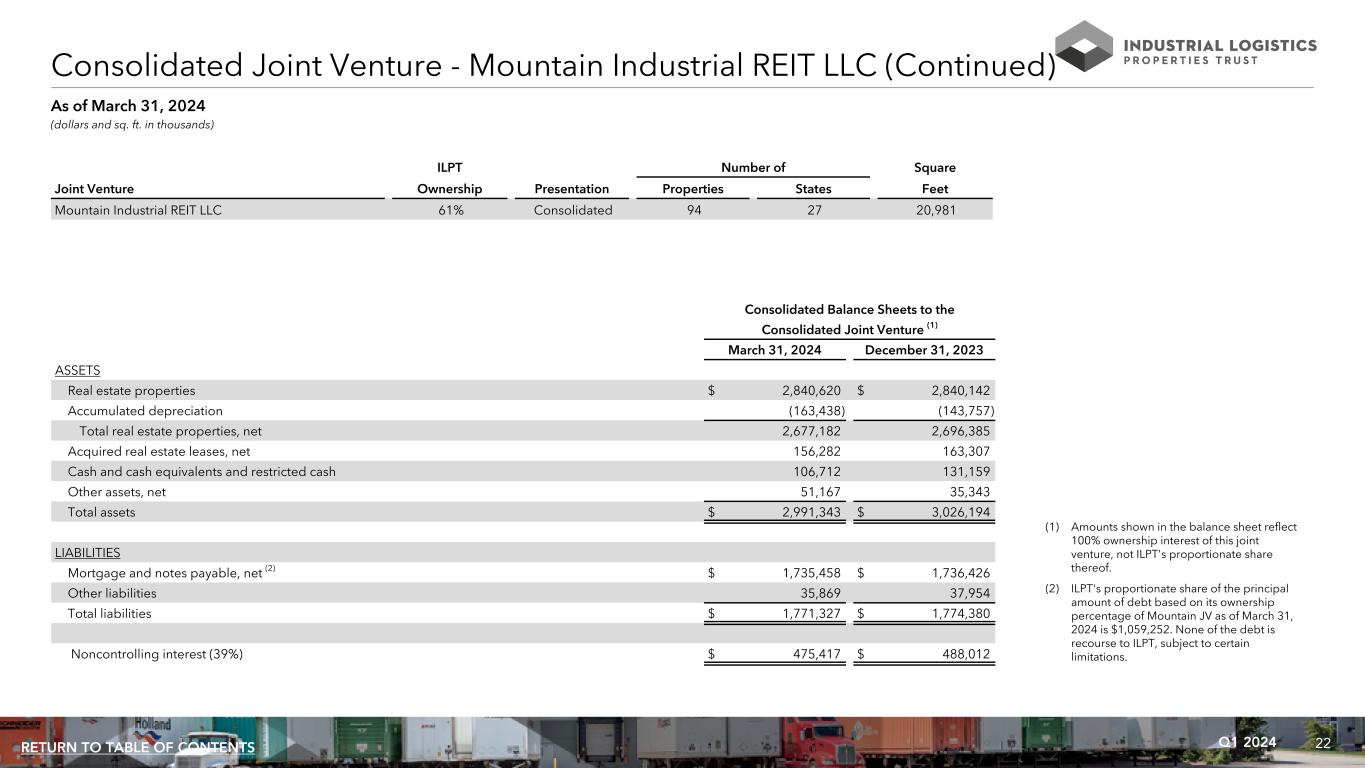 22Q1 2024RETURN TO TABLE OF CONTENTS (dollars and sq. ft. in thousands) ILPT Number of Square Joint Venture Ownership Presentation Properties States Feet Mountain Industrial REIT LLC 61% Consolidated 94 27 20,981 (1) Amounts shown in the balance sheet reflect 100% ownership interest of this joint venture, not ILPT's proportionate share thereof. (2) ILPT's proportionate share of the principal amount of debt based on its ownership percentage of Mountain JV as of March 31, 2024 is $1,059,252. None of the debt is recourse to ILPT, subject to certain limitations. As of March 31, 2024 Consolidated Balance Sheets to the Consolidated Joint Venture (1) March 31, 2024 December 31, 2023 ASSETS Real estate properties $ 2,840,620 $ 2,840,142 Accumulated depreciation (163,438) (143,757) Total real estate properties, net 2,677,182 2,696,385 Acquired real estate leases, net 156,282 163,307 Cash and cash equivalents and restricted cash 106,712 131,159 Other assets, net 51,167 35,343 Total assets $ 2,991,343 $ 3,026,194 LIABILITIES Mortgage and notes payable, net (2) $ 1,735,458 $ 1,736,426 Other liabilities 35,869 37,954 Total liabilities $ 1,771,327 $ 1,774,380 Noncontrolling interest (39%) $ 475,417 $ 488,012 Consolidated Joint Venture - Mountain Industrial REIT LLC (Continued)