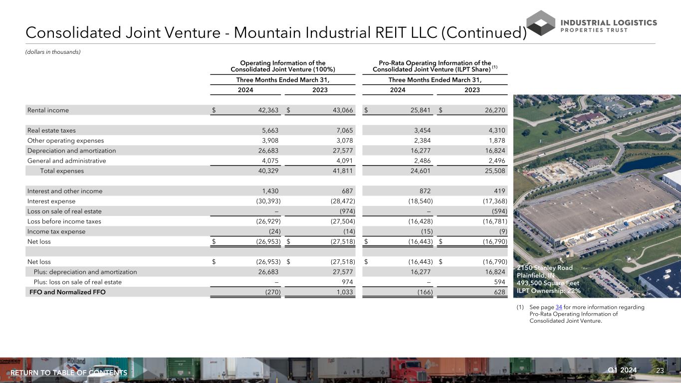 23Q1 2024RETURN TO TABLE OF CONTENTS Operating Information of the Consolidated Joint Venture (100%) Pro-Rata Operating Information of the Consolidated Joint Venture (ILPT Share) (1) Three Months Ended March 31, Three Months Ended March 31, 2024 2023 2024 2023 Rental income $ 42,363 $ 43,066 $ 25,841 $ 26,270 Real estate taxes 5,663 7,065 3,454 4,310 Other operating expenses 3,908 3,078 2,384 1,878 Depreciation and amortization 26,683 27,577 16,277 16,824 General and administrative 4,075 4,091 2,486 2,496 Total expenses 40,329 41,811 24,601 25,508 Interest and other income 1,430 687 872 419 Interest expense (30,393) (28,472) (18,540) (17,368) Loss on sale of real estate — (974) — (594) Loss before income taxes (26,929) (27,504) (16,428) (16,781) Income tax expense (24) (14) (15) (9) Net loss $ (26,953) $ (27,518) $ (16,443) $ (16,790) Net loss $ (26,953) $ (27,518) $ (16,443) $ (16,790) Plus: depreciation and amortization 26,683 27,577 16,277 16,824 Plus: loss on sale of real estate — 974 — 594 FFO and Normalized FFO (270) 1,033 (166) 628 (dollars in thousands) (1) See page 34 for more information regarding Pro-Rata Operating Information of Consolidated Joint Venture. 2150 Stanley Road Plainfield, IN 493,500 Square Feet ILPT Ownership: 22% Consolidated Joint Venture - Mountain Industrial REIT LLC (Continued)