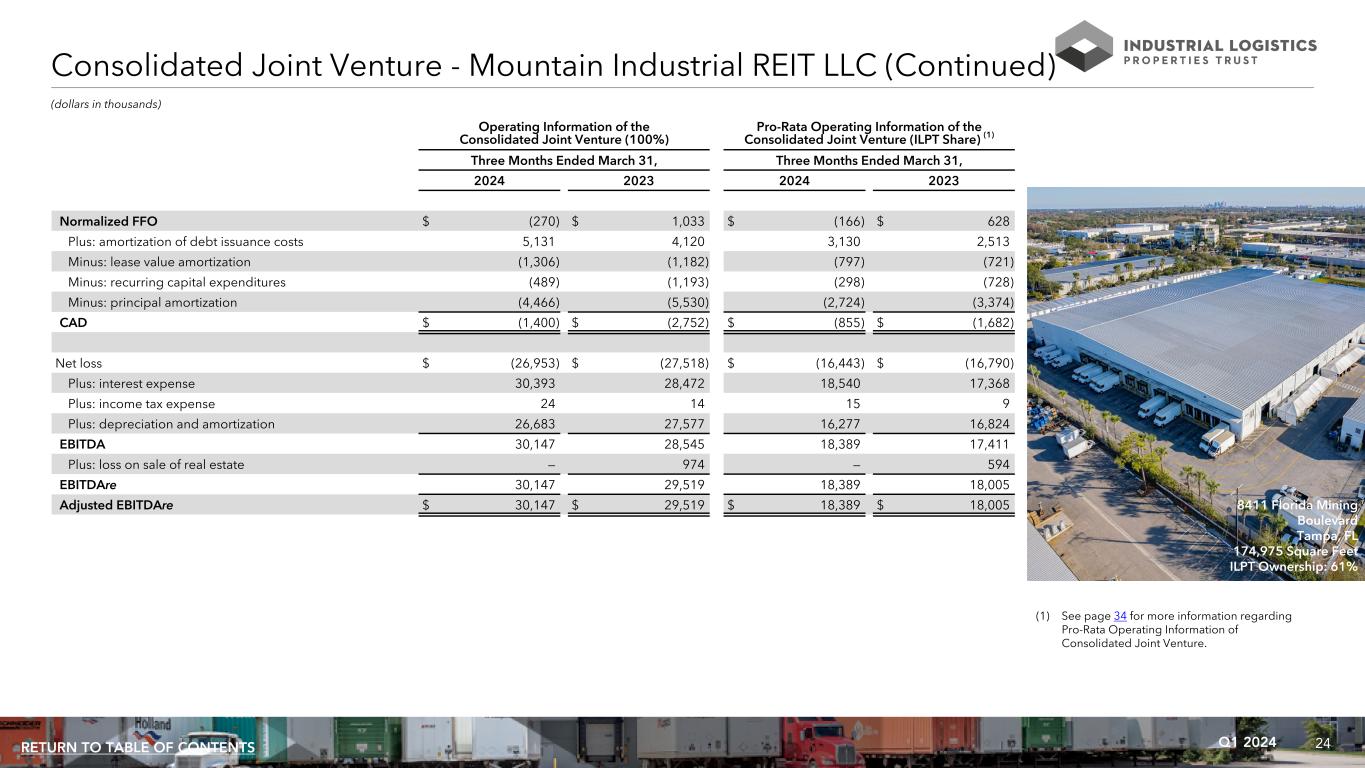 24Q1 2024RETURN TO TABLE OF CONTENTS Operating Information of the Consolidated Joint Venture (100%) Pro-Rata Operating Information of the Consolidated Joint Venture (ILPT Share) (1) Three Months Ended March 31, Three Months Ended March 31, 2024 2023 2024 2023 Normalized FFO $ (270) $ 1,033 $ (166) $ 628 Plus: amortization of debt issuance costs 5,131 4,120 3,130 2,513 Minus: lease value amortization (1,306) (1,182) (797) (721) Minus: recurring capital expenditures (489) (1,193) (298) (728) Minus: principal amortization (4,466) (5,530) (2,724) (3,374) CAD $ (1,400) $ (2,752) $ (855) $ (1,682) Net loss $ (26,953) $ (27,518) $ (16,443) $ (16,790) Plus: interest expense 30,393 28,472 18,540 17,368 Plus: income tax expense 24 14 15 9 Plus: depreciation and amortization 26,683 27,577 16,277 16,824 EBITDA 30,147 28,545 18,389 17,411 Plus: loss on sale of real estate — 974 — 594 EBITDAre 30,147 29,519 18,389 18,005 Adjusted EBITDAre $ 30,147 $ 29,519 $ 18,389 $ 18,005 (dollars in thousands) 8411 Florida Mining Boulevard Tampa, FL 174,975 Square Feet ILPT Ownership: 61% Consolidated Joint Venture - Mountain Industrial REIT LLC (Continued) (1) See page 34 for more information regarding Pro-Rata Operating Information of Consolidated Joint Venture.