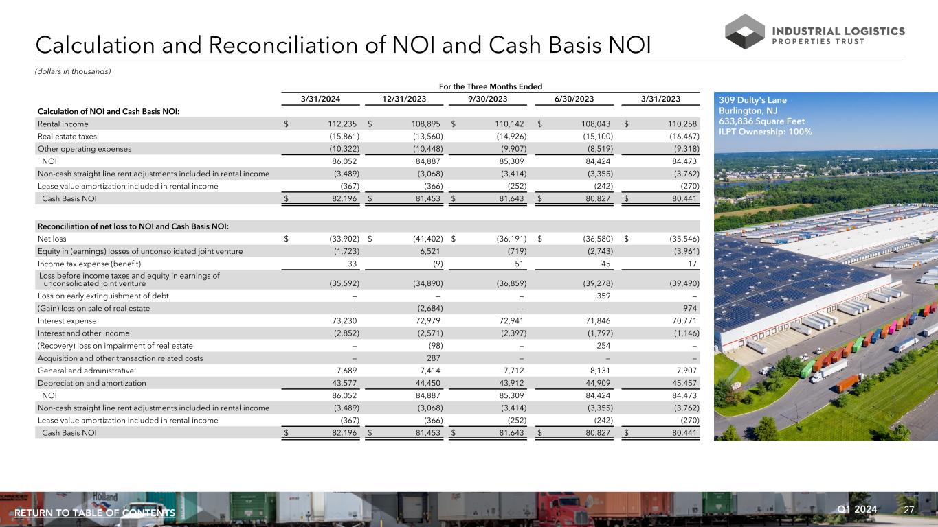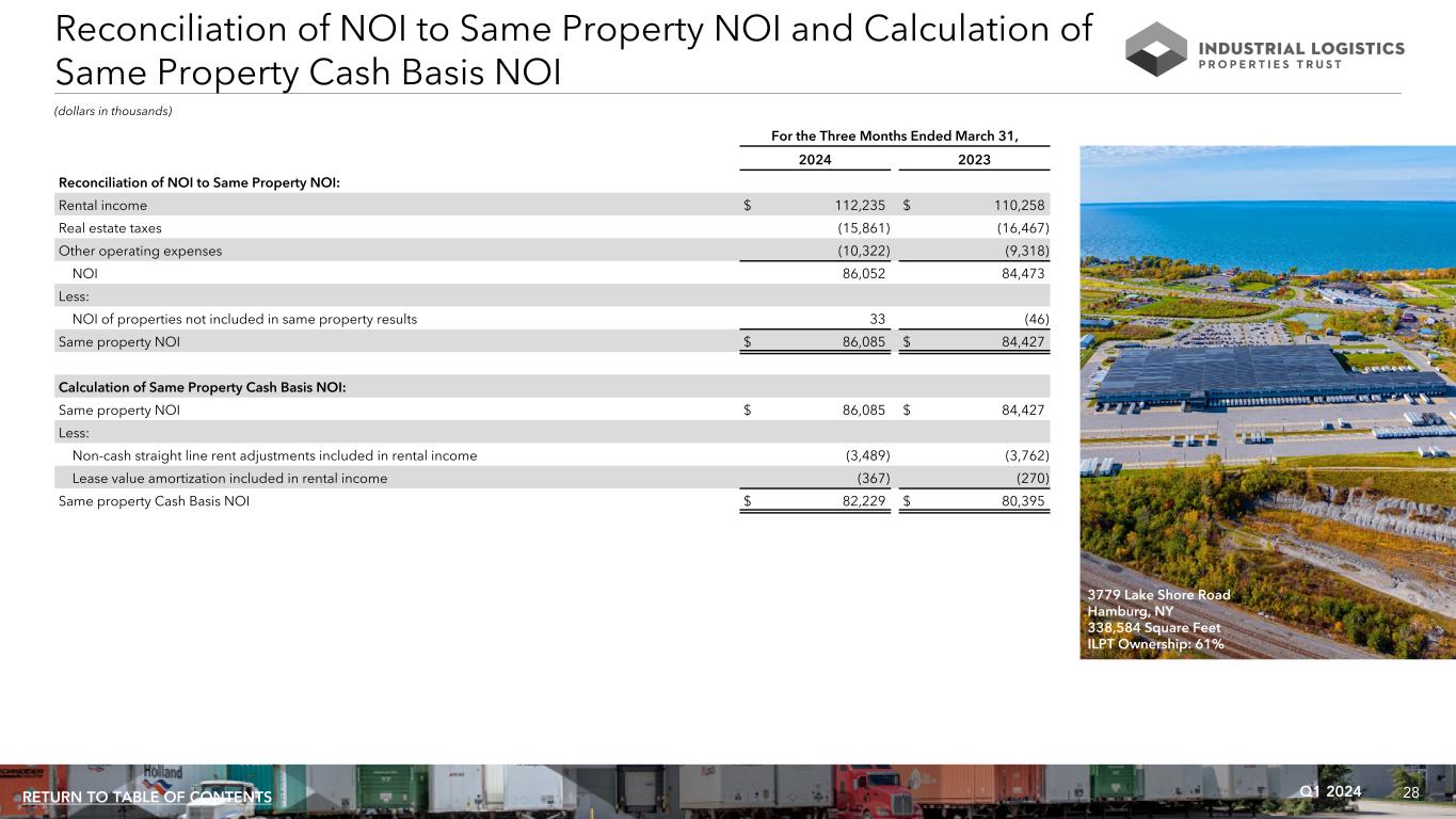 27Q1 2024RETURN TO TABLE OF CONTENTS Calculation and Reconciliation of NOI and Cash Basis NOI (dollars in thousands) For the Three Months Ended 3/31/2024 12/31/2023 9/30/2023 6/30/2023 3/31/2023 Calculation of NOI and Cash Basis NOI: Rental income $ 112,235 $ 108,895 $ 110,142 $ 108,043 $ 110,258 Real estate taxes (15,861) (13,560) (14,926) (15,100) (16,467) Other operating expenses (10,322) (10,448) (9,907) (8,519) (9,318) NOI 86,052 84,887 85,309 84,424 84,473 Non-cash straight line rent adjustments included in rental income (3,489) (3,068) (3,414) (3,355) (3,762) Lease value amortization included in rental income (367) (366) (252) (242) (270) Cash Basis NOI $ 82,196 $ 81,453 $ 81,643 $ 80,827 $ 80,441 Reconciliation of net loss to NOI and Cash Basis NOI: Net loss $ (33,902) $ (41,402) $ (36,191) $ (36,580) $ (35,546) Equity in (earnings) losses of unconsolidated joint venture (1,723) 6,521 (719) (2,743) (3,961) Income tax expense (benefit) 33 (9) 51 45 17 Loss before income taxes and equity in earnings of unconsolidated joint venture (35,592) (34,890) (36,859) (39,278) (39,490) Loss on early extinguishment of debt — — — 359 — (Gain) loss on sale of real estate — (2,684) — — 974 Interest expense 73,230 72,979 72,941 71,846 70,771 Interest and other income (2,852) (2,571) (2,397) (1,797) (1,146) (Recovery) loss on impairment of real estate — (98) — 254 — Acquisition and other transaction related costs — 287 — — — General and administrative 7,689 7,414 7,712 8,131 7,907 Depreciation and amortization 43,577 44,450 43,912 44,909 45,457 NOI 86,052 84,887 85,309 84,424 84,473 Non-cash straight line rent adjustments included in rental income (3,489) (3,068) (3,414) (3,355) (3,762) Lease value amortization included in rental income (367) (366) (252) (242) (270) Cash Basis NOI $ 82,196 $ 81,453 $ 81,643 $ 80,827 $ 80,441 309 Dulty's Lane Burlington, NJ 633,836 Square Feet ILPT Ownership: 100%