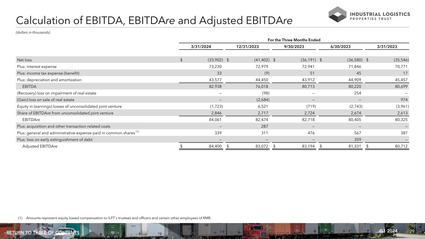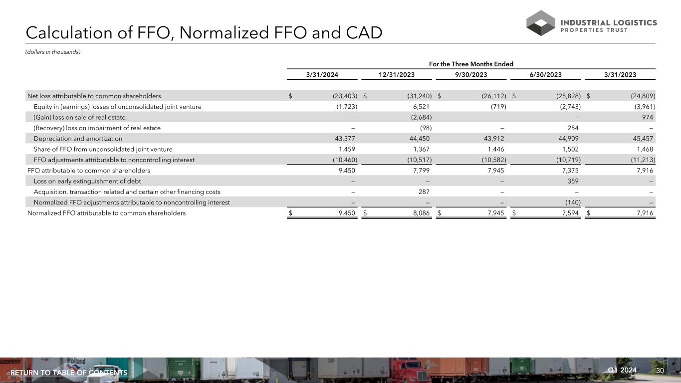 29Q1 2024RETURN TO TABLE OF CONTENTS Calculation of EBITDA, EBITDAre and Adjusted EBITDAre (dollars in thousands) For the Three Months Ended 3/31/2024 12/31/2023 9/30/2023 6/30/2023 3/31/2023 Net loss $ (33,902) $ (41,402) $ (36,191) $ (36,580) $ (35,546) Plus: interest expense 73,230 72,979 72,941 71,846 70,771 Plus: income tax expense (benefit) 33 (9) 51 45 17 Plus: depreciation and amortization 43,577 44,450 43,912 44,909 45,457 EBITDA 82,938 76,018 80,713 80,220 80,699 (Recovery) loss on impairment of real estate — (98) — 254 — (Gain) loss on sale of real estate — (2,684) — — 974 Equity in (earnings) losses of unconsolidated joint venture (1,723) 6,521 (719) (2,743) (3,961) Share of EBITDAre from unconsolidated joint venture 2,846 2,717 2,724 2,674 2,613 EBITDAre 84,061 82,474 82,718 80,405 80,325 Plus: acquisition and other transaction related costs — 287 — — — Plus: general and administrative expense paid in common shares (1) 339 311 476 567 387 Plus: loss on early extinguishment of debt — — — 359 — Adjusted EBITDAre $ 84,400 $ 83,072 $ 83,194 $ 81,331 $ 80,712 (1) Amounts represent equity based compensation to ILPT's trustees and officers and certain other employees of RMR.