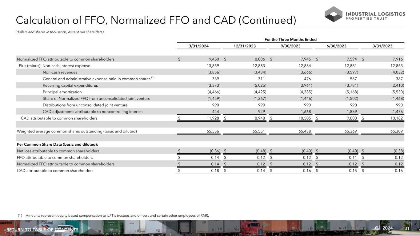 31Q1 2024RETURN TO TABLE OF CONTENTS (dollars and shares in thousands, except per share data) For the Three Months Ended 3/31/2024 12/31/2023 9/30/2023 6/30/2023 3/31/2023 Normalized FFO attributable to common shareholders $ 9,450 $ 8,086 $ 7,945 $ 7,594 $ 7,916 Plus (minus): Non-cash interest expense 13,859 12,883 12,884 12,861 12,853 Non-cash revenues (3,856) (3,434) (3,666) (3,597) (4,032) General and administrative expense paid in common shares (1) 339 311 476 567 387 Recurring capital expenditures (3,373) (5,025) (3,961) (3,781) (2,410) Principal amortization (4,466) (4,425) (4,385) (5,168) (5,530) Share of Normalized FFO from unconsolidated joint venture (1,459) (1,367) (1,446) (1,502) (1,468) Distributions from unconsolidated joint venture 990 990 990 990 990 CAD adjustments attributable to noncontrolling interest 444 929 1,668 1,839 1,476 CAD attributable to common shareholders $ 11,928 $ 8,948 $ 10,505 $ 9,803 $ 10,182 Weighted average common shares outstanding (basic and diluted) 65,556 65,551 65,488 65,369 65,309 Per Common Share Data (basic and diluted): Net loss attributable to common shareholders $ (0.36) $ (0.48) $ (0.40) $ (0.40) $ (0.38) FFO attributable to common shareholders $ 0.14 $ 0.12 $ 0.12 $ 0.11 $ 0.12 Normalized FFO attributable to common shareholders $ 0.14 $ 0.12 $ 0.12 $ 0.12 $ 0.12 CAD attributable to common shareholders $ 0.18 $ 0.14 $ 0.16 $ 0.15 $ 0.16 Calculation of FFO, Normalized FFO and CAD (Continued) (1) Amounts represent equity based compensation to ILPT's trustees and officers and certain other employees of RMR.